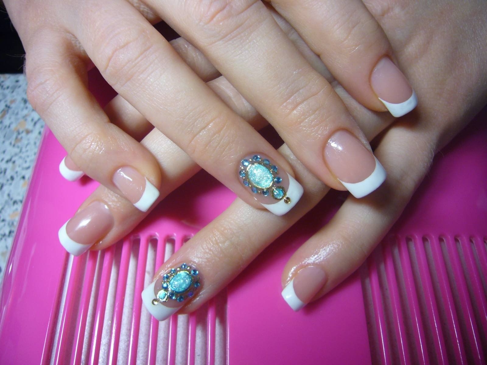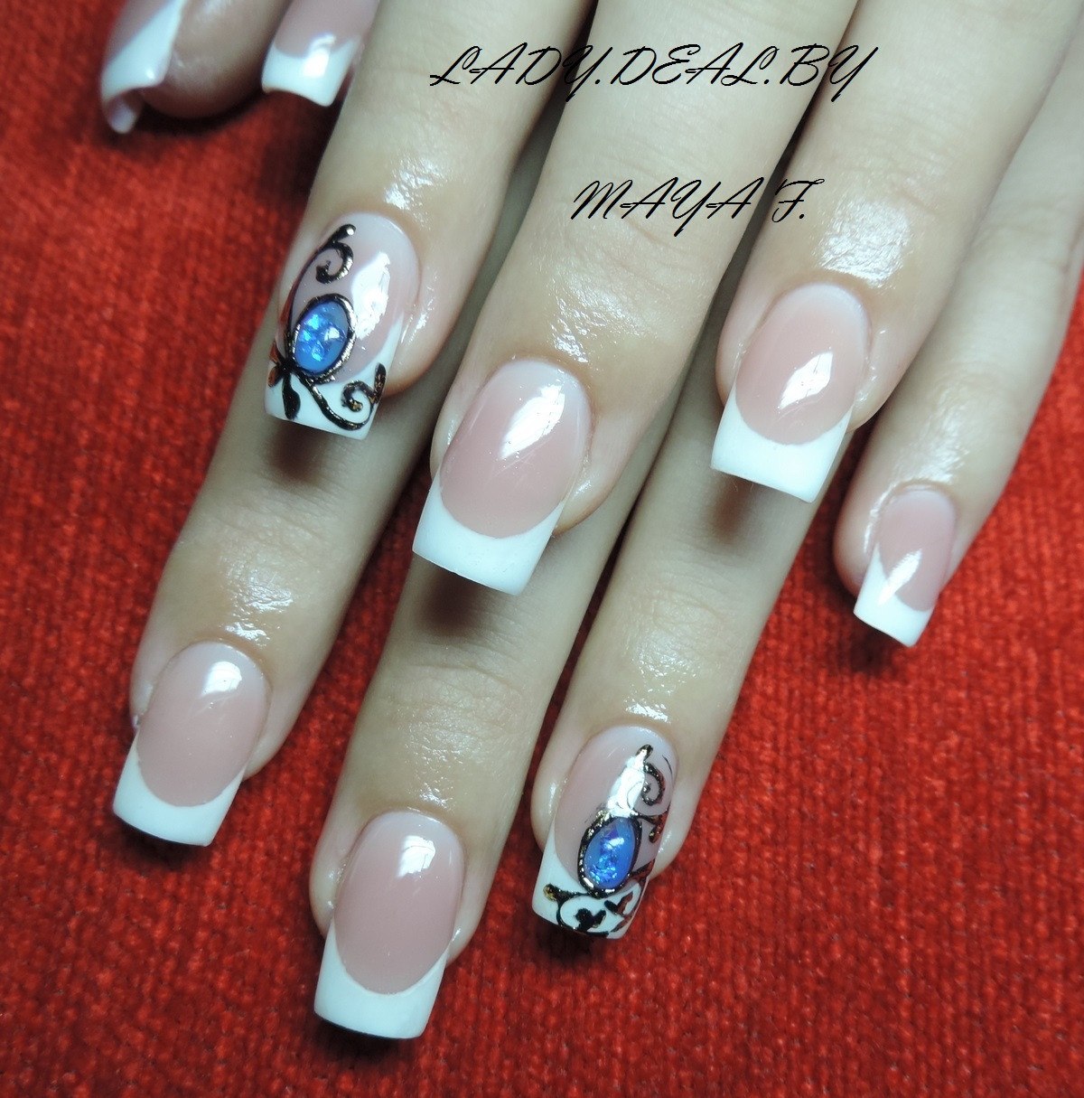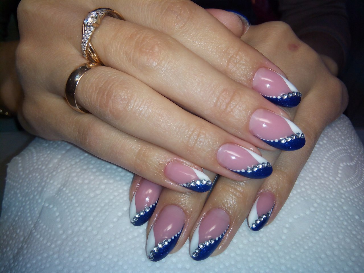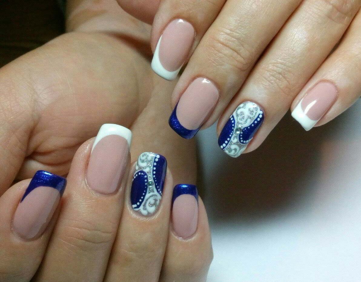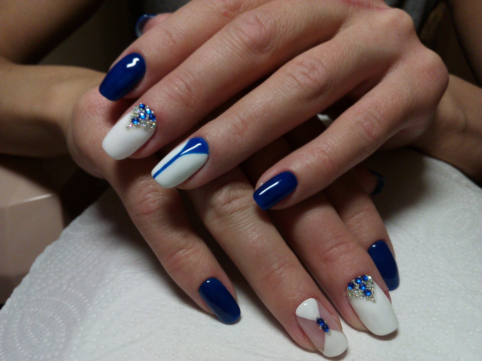 Белый френч с искусственными синими камнями на ногтях (60 фото)