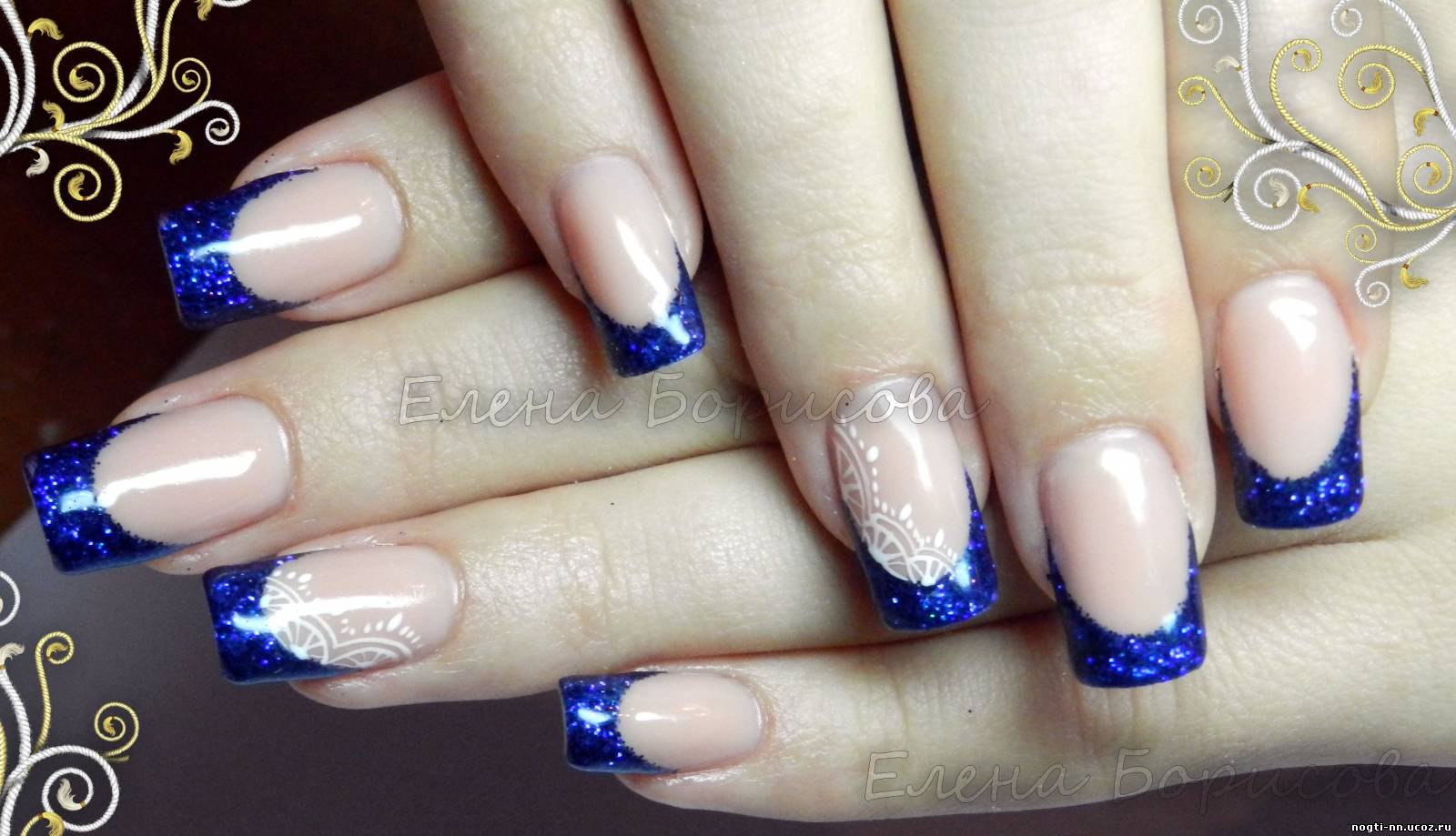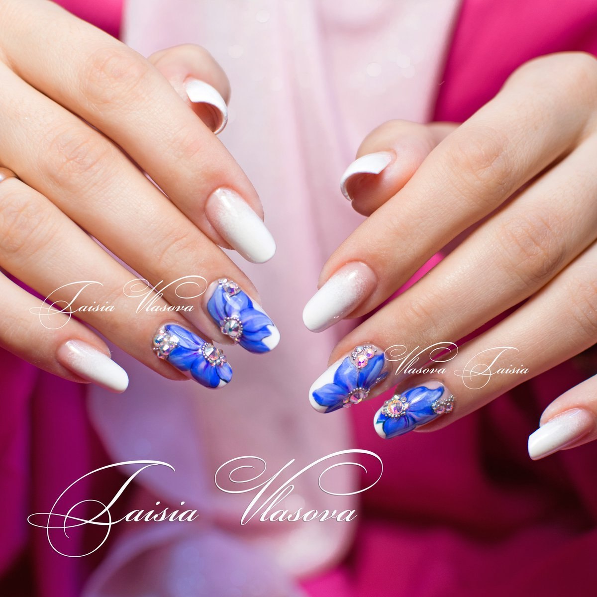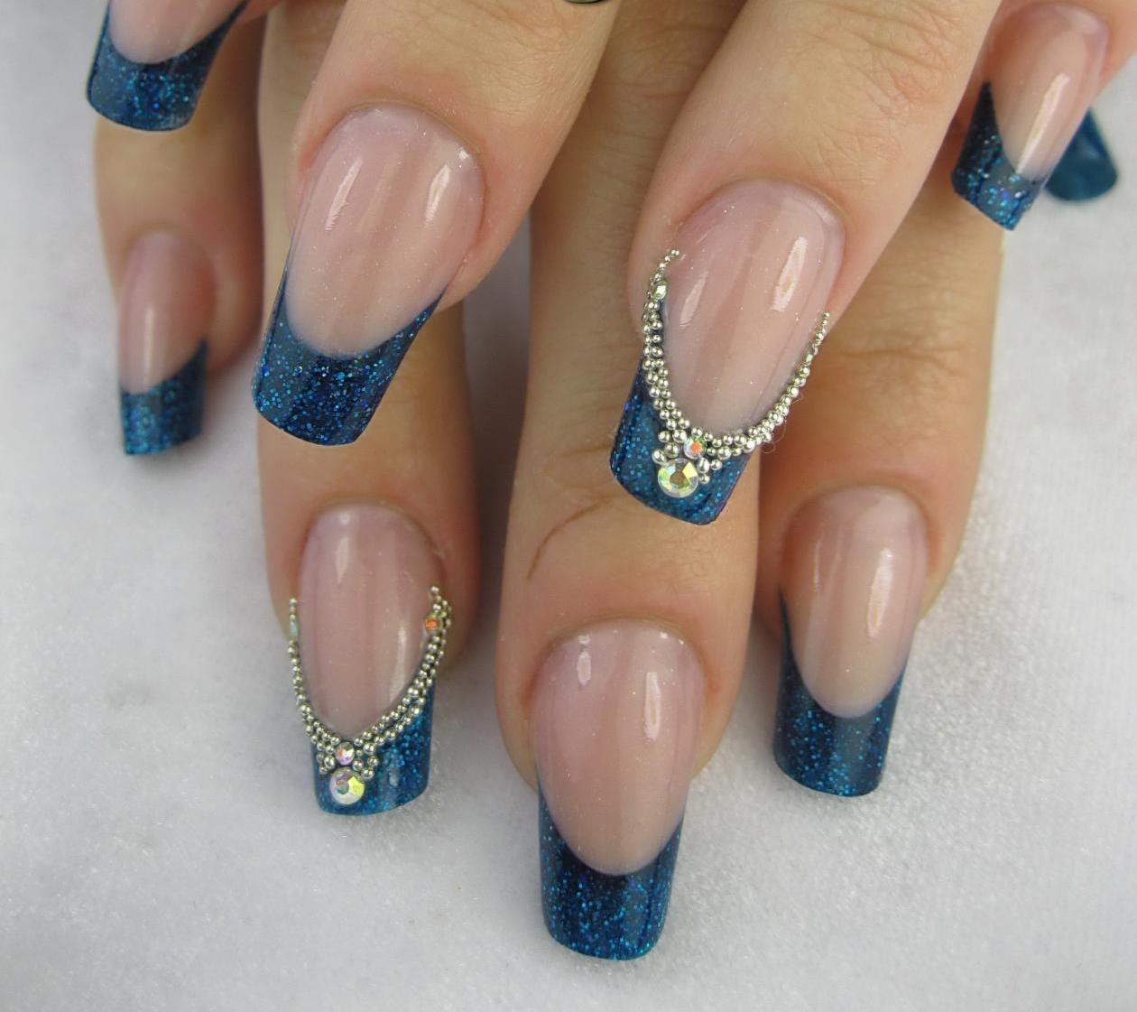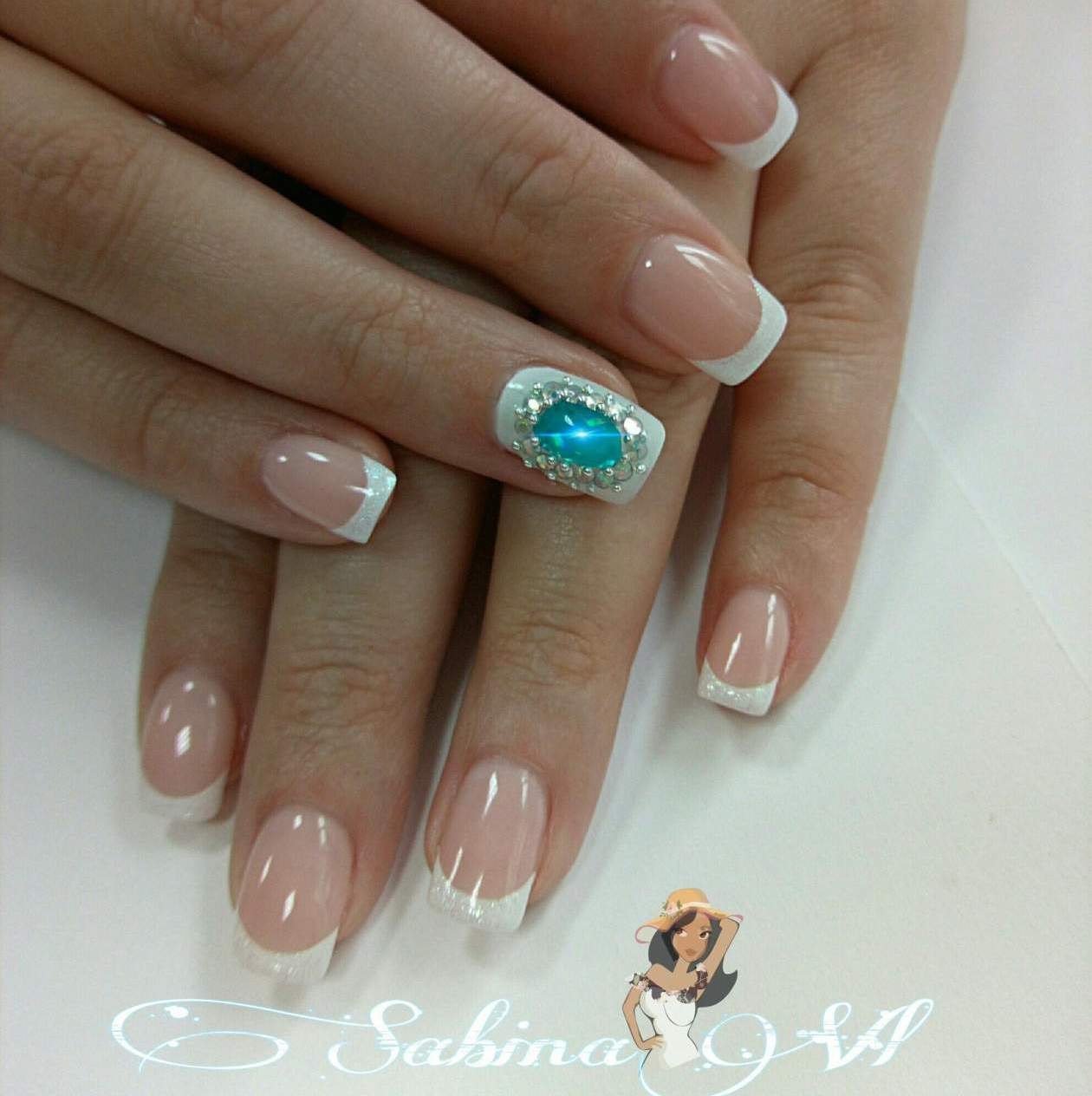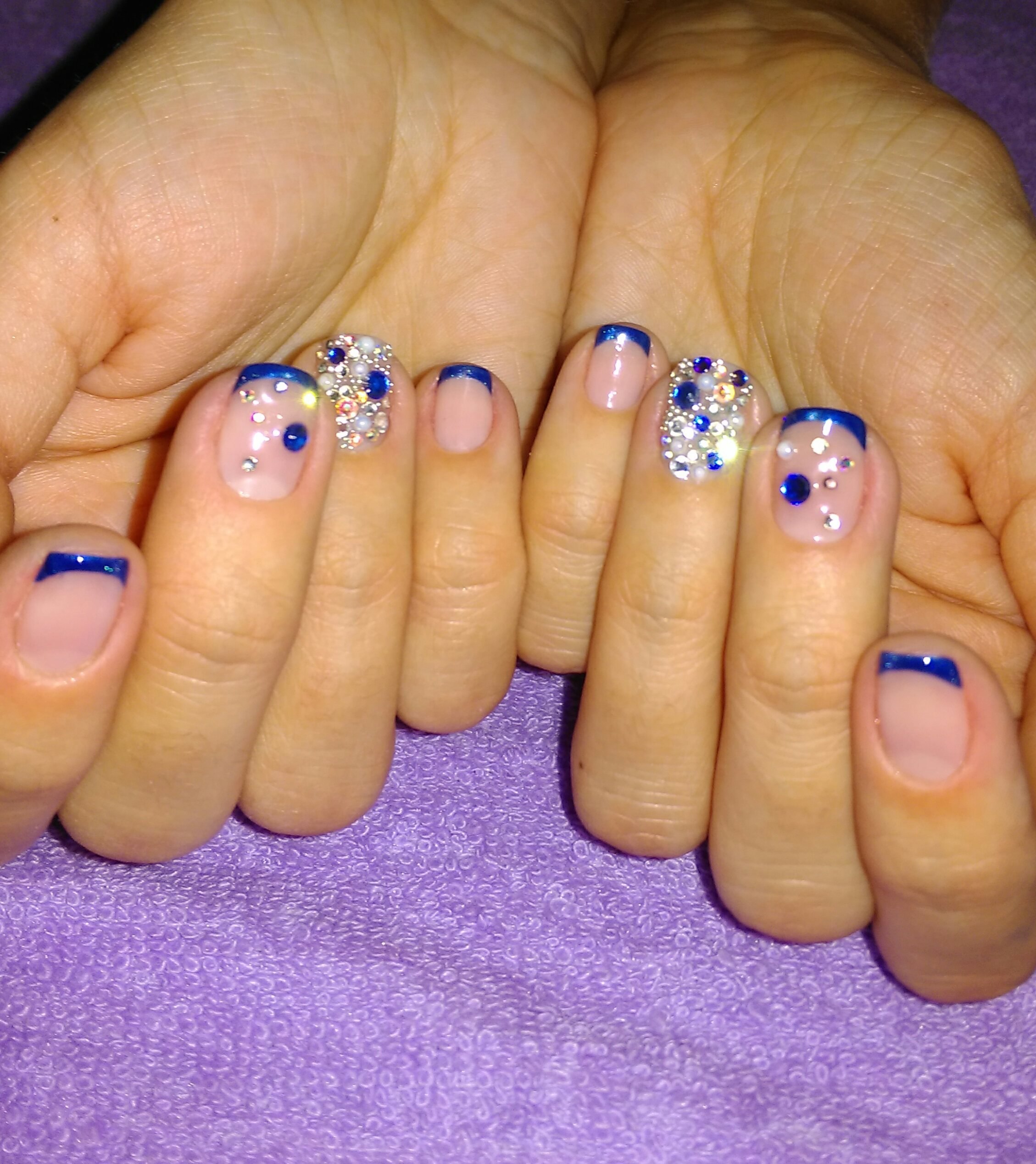 Белый френч с искусственными синими камнями на ногтях (60 фото)
