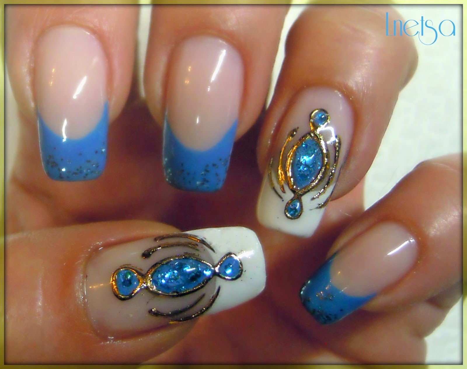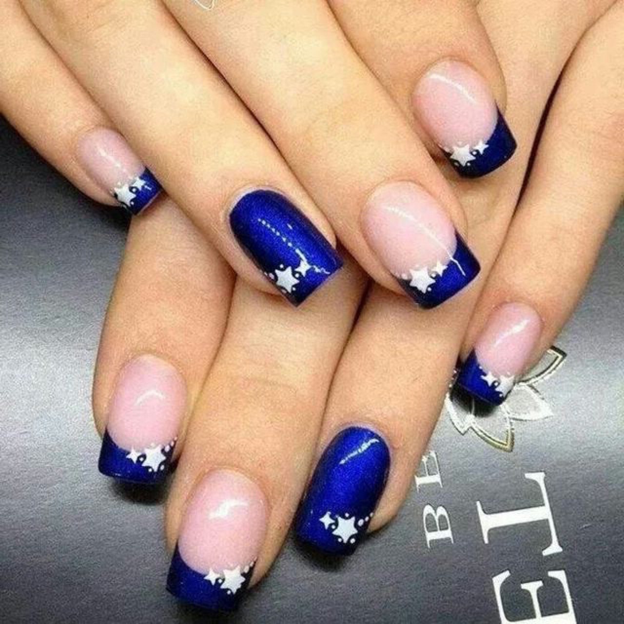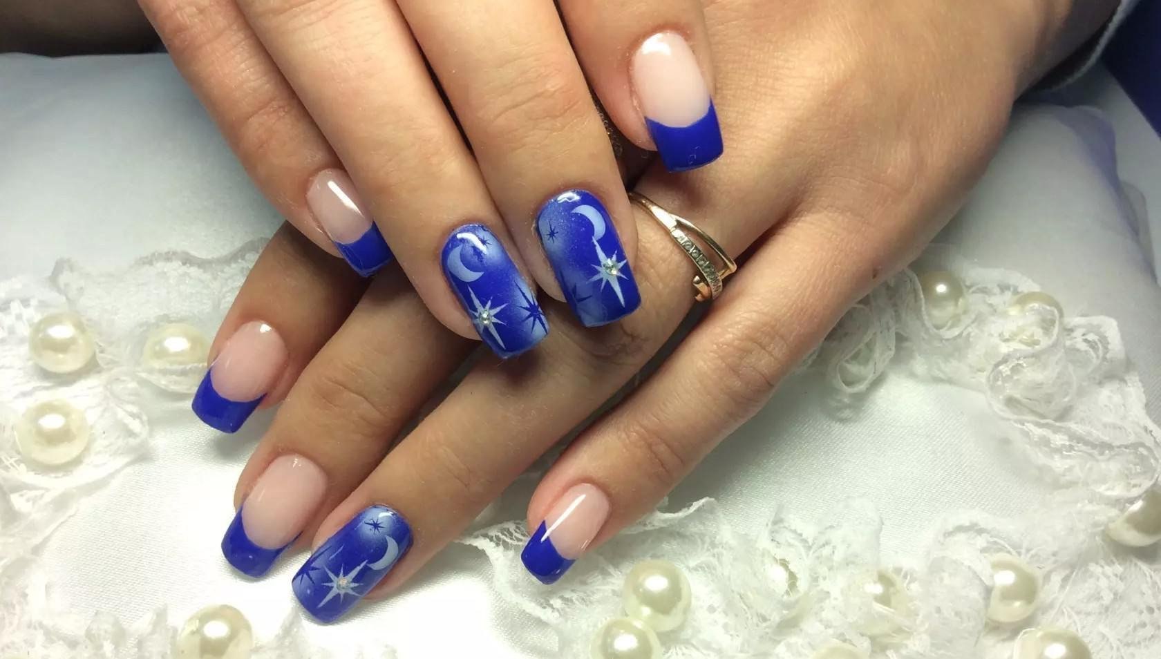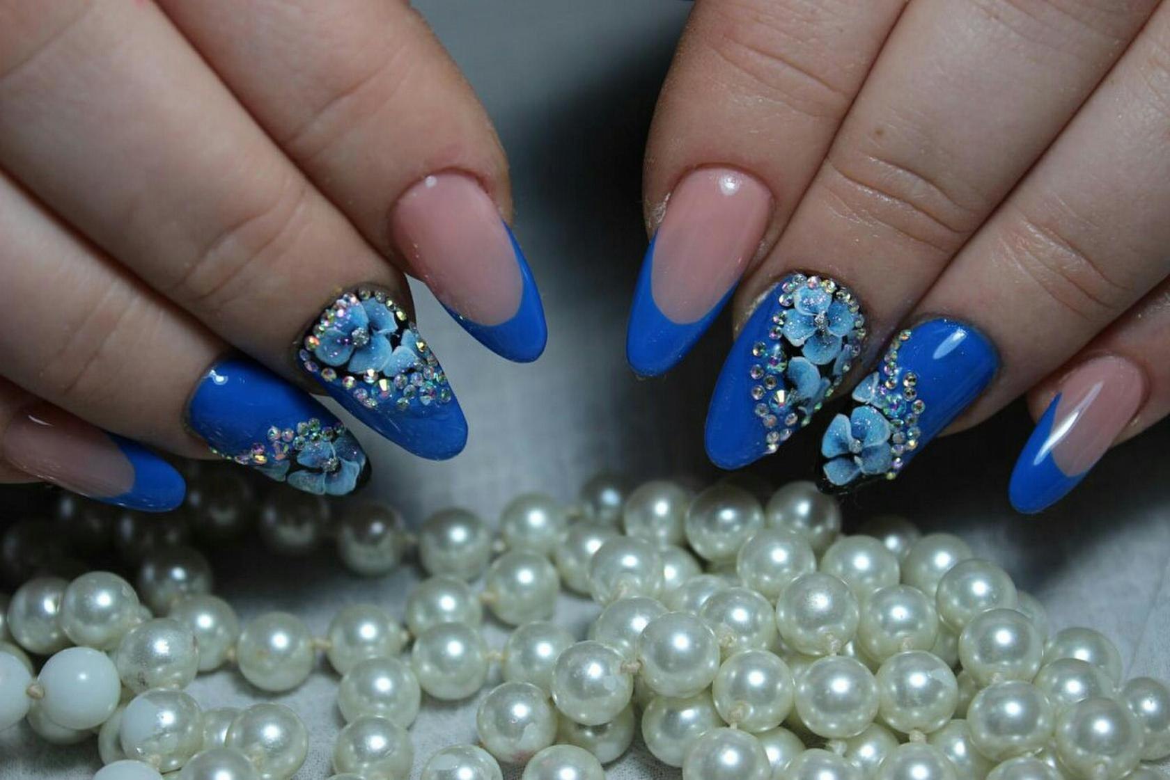 Белый френч с искусственными синими камнями на ногтях (60 фото)