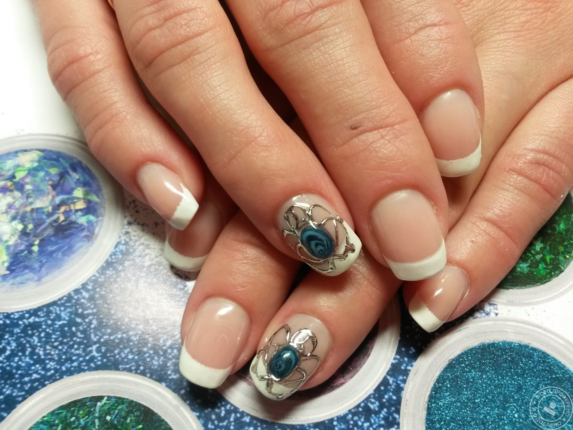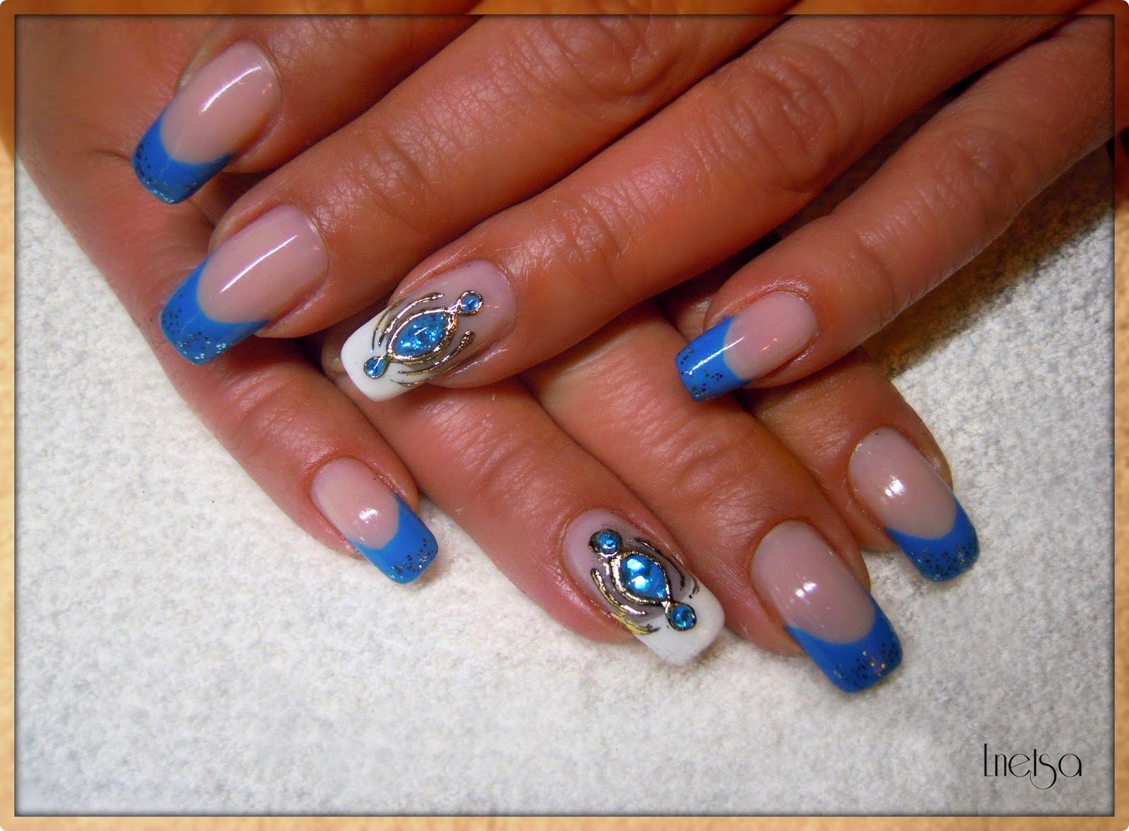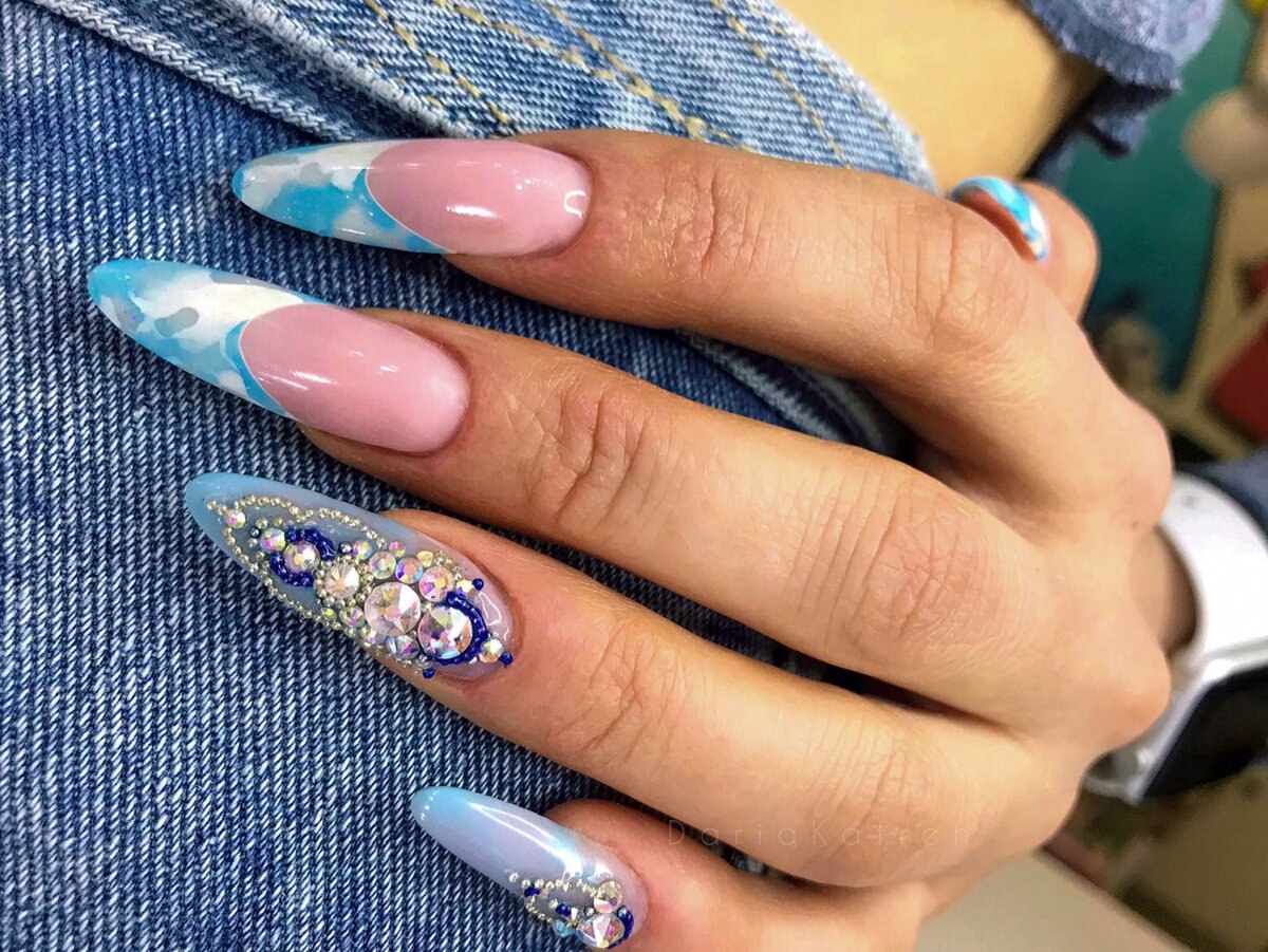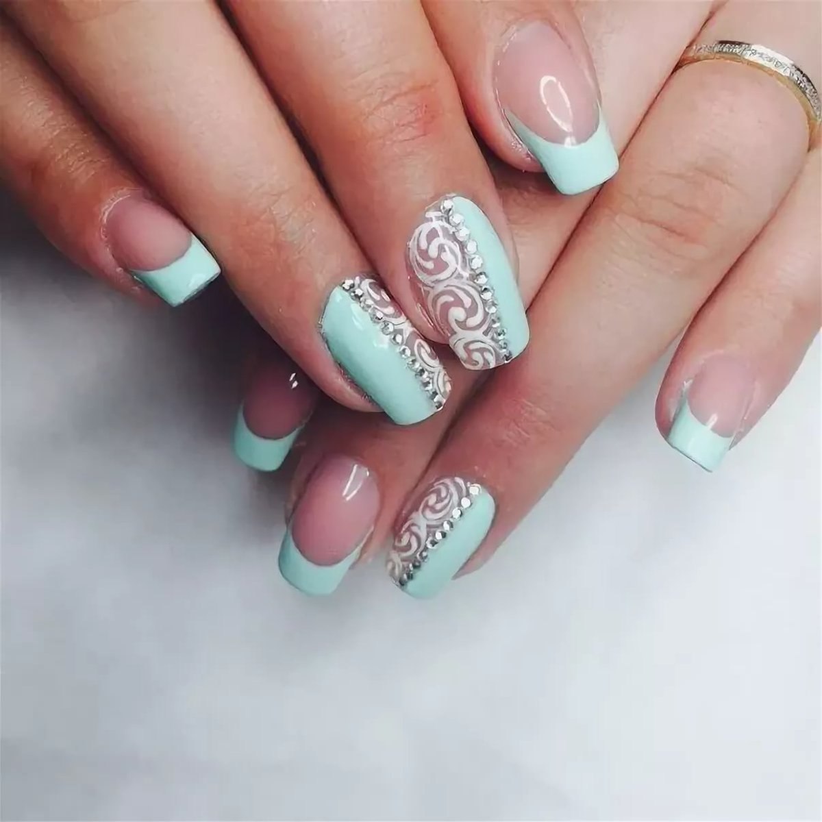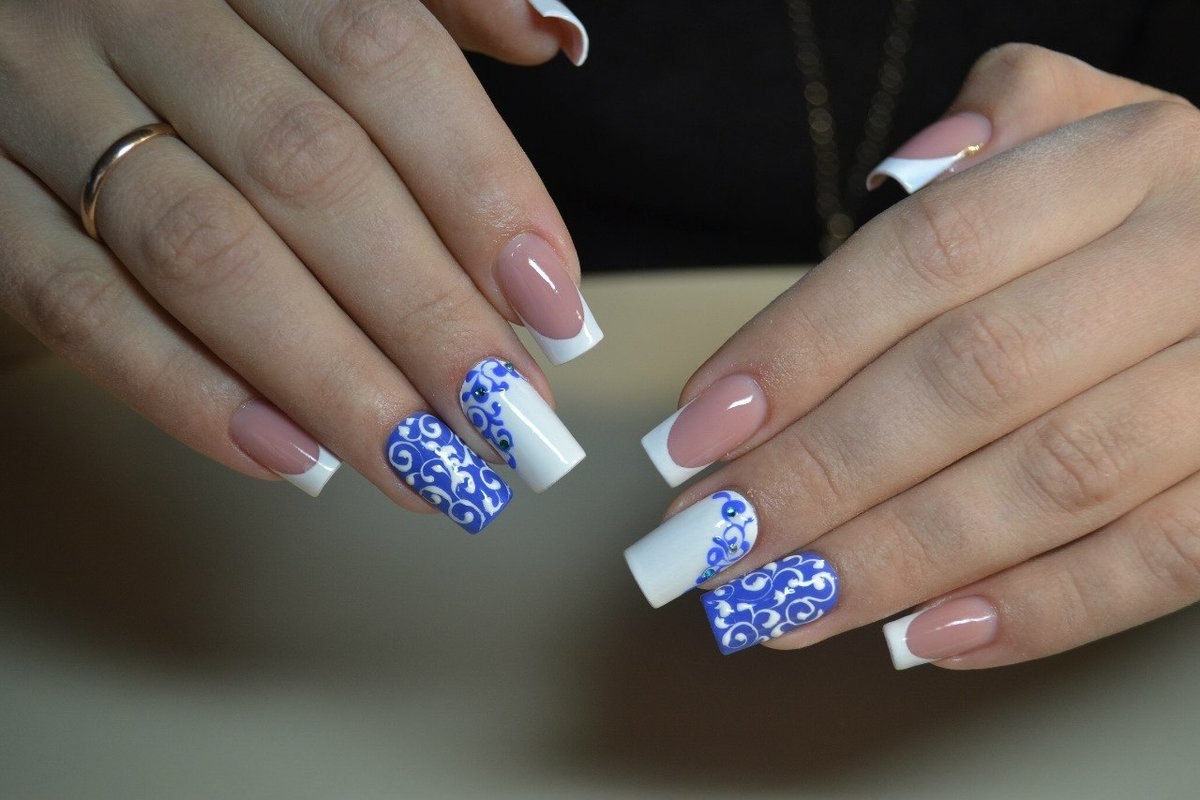 Белый френч с искусственными синими камнями на ногтях (60 фото)