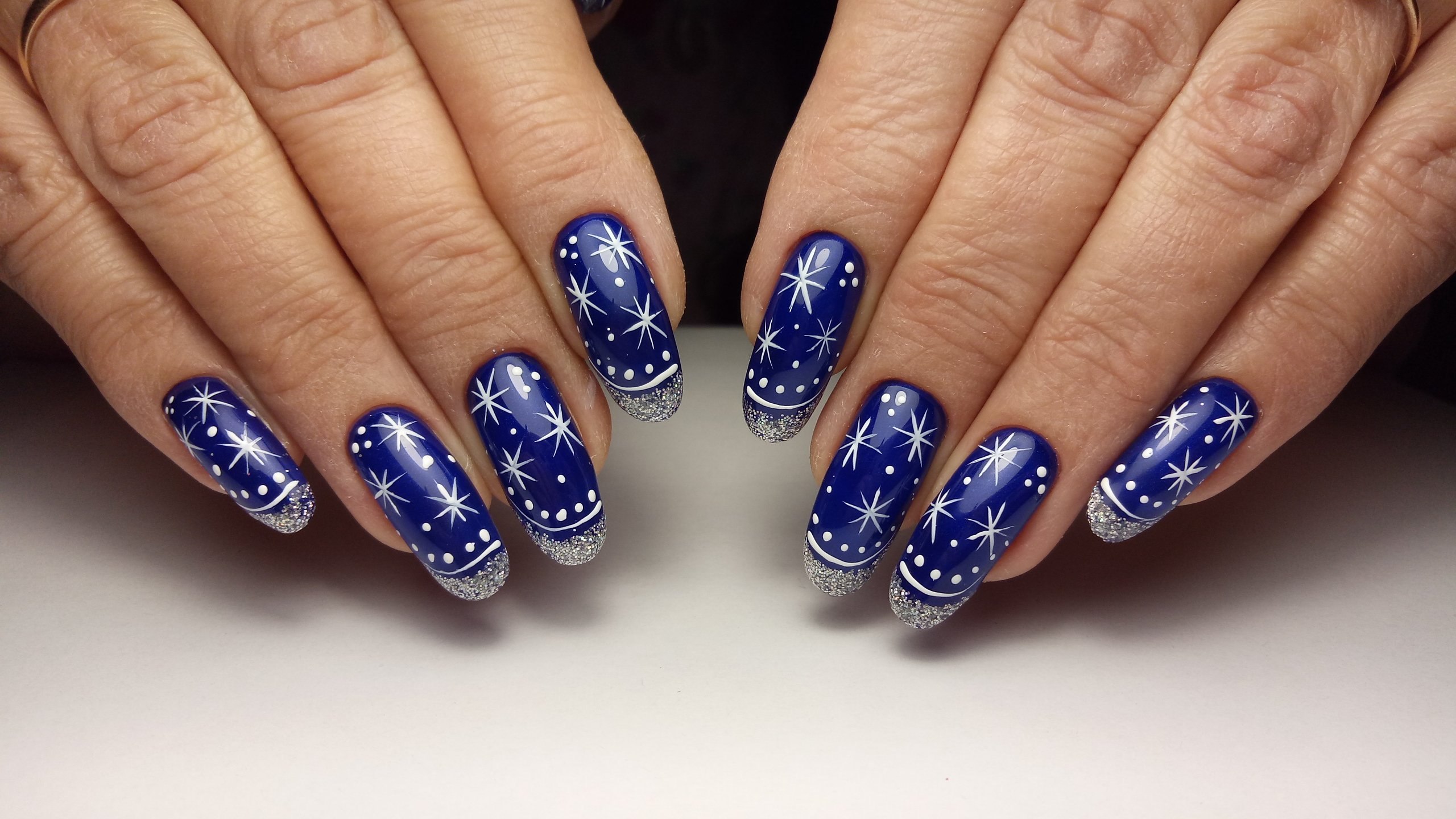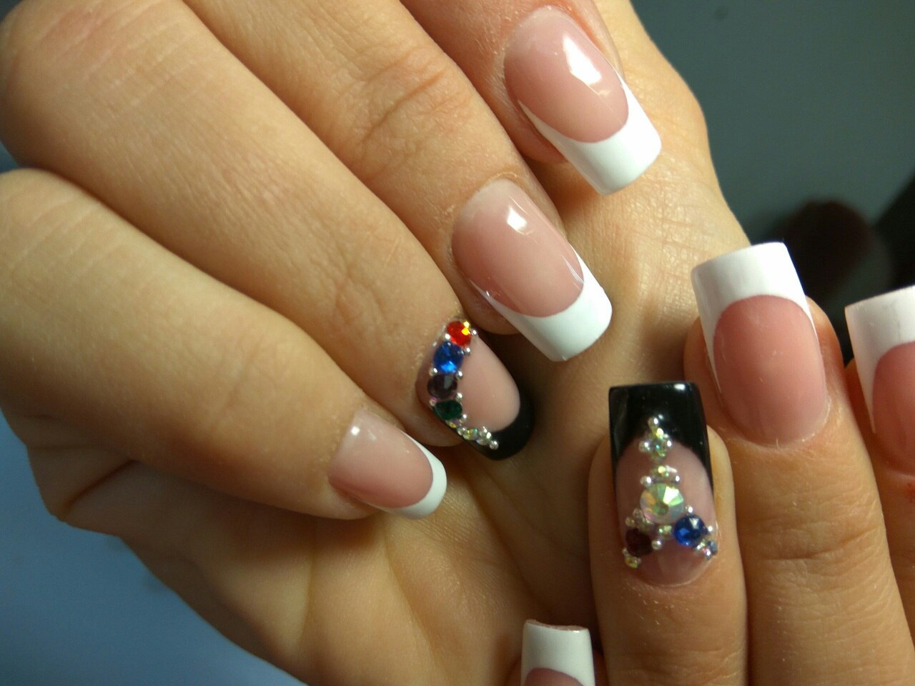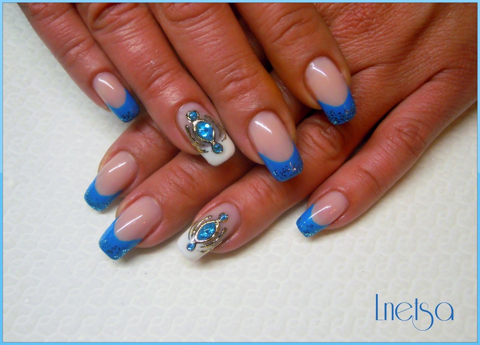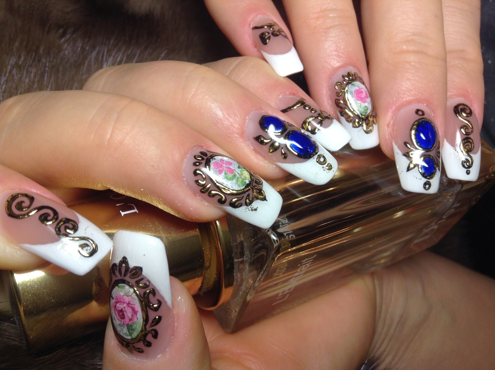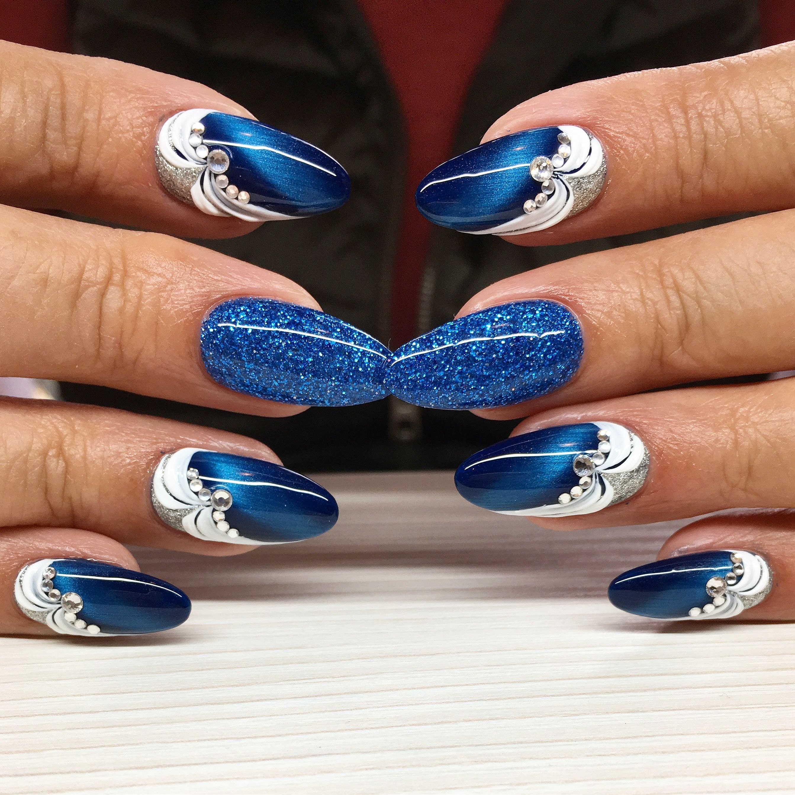 Белый френч с искусственными синими камнями на ногтях (60 фото)