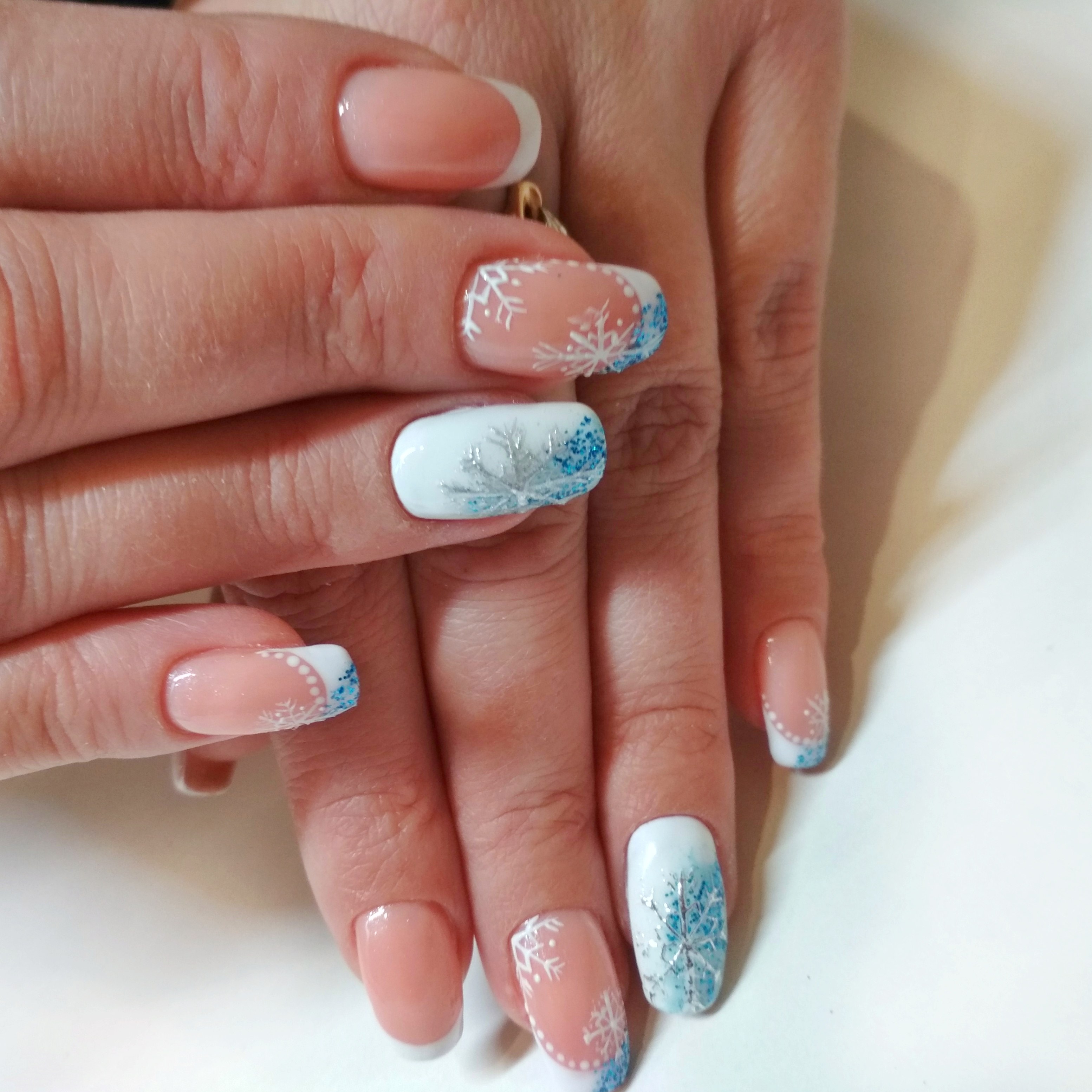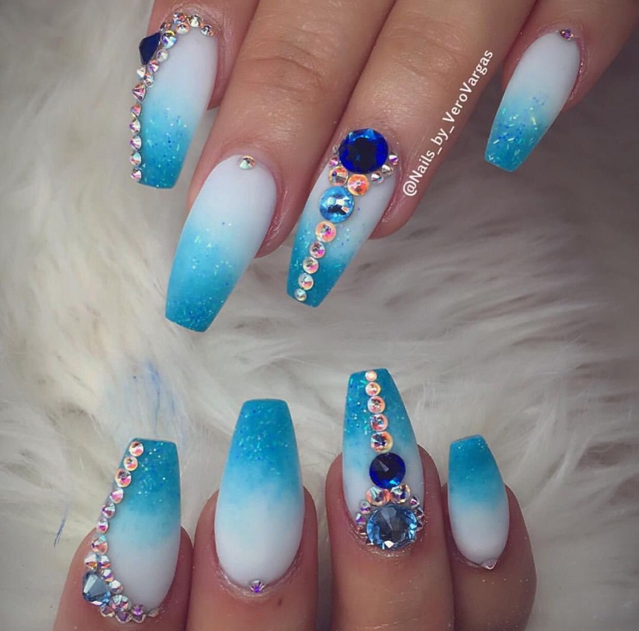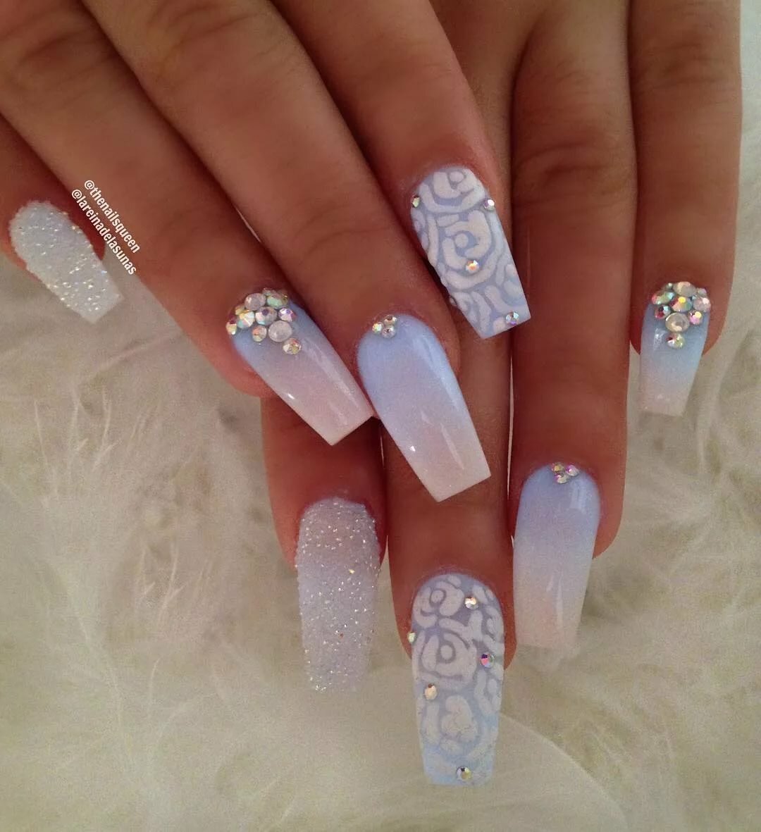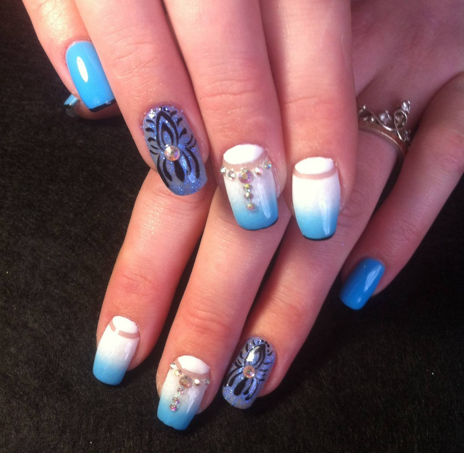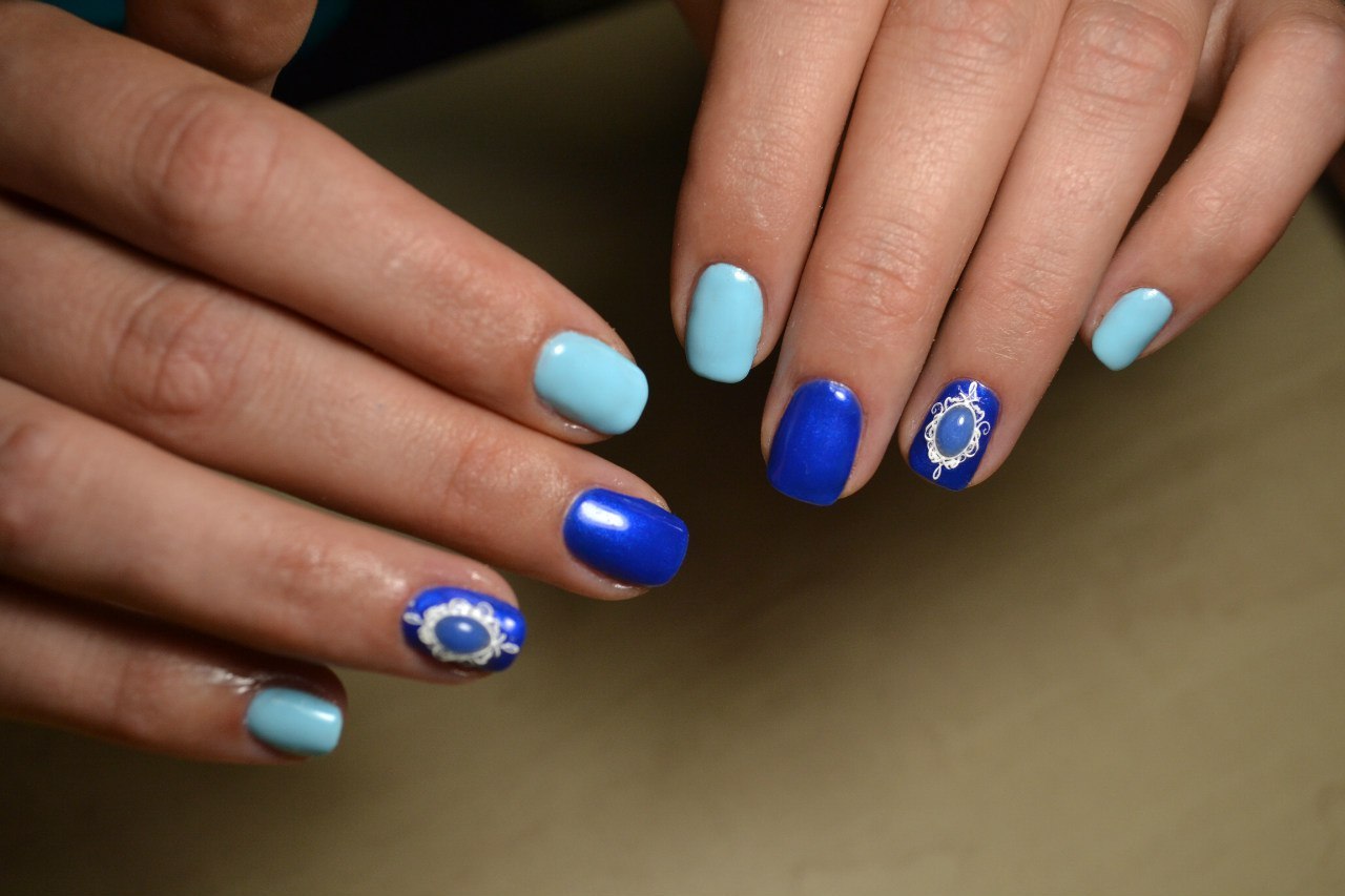 Белый френч с искусственными синими камнями на ногтях (60 фото)