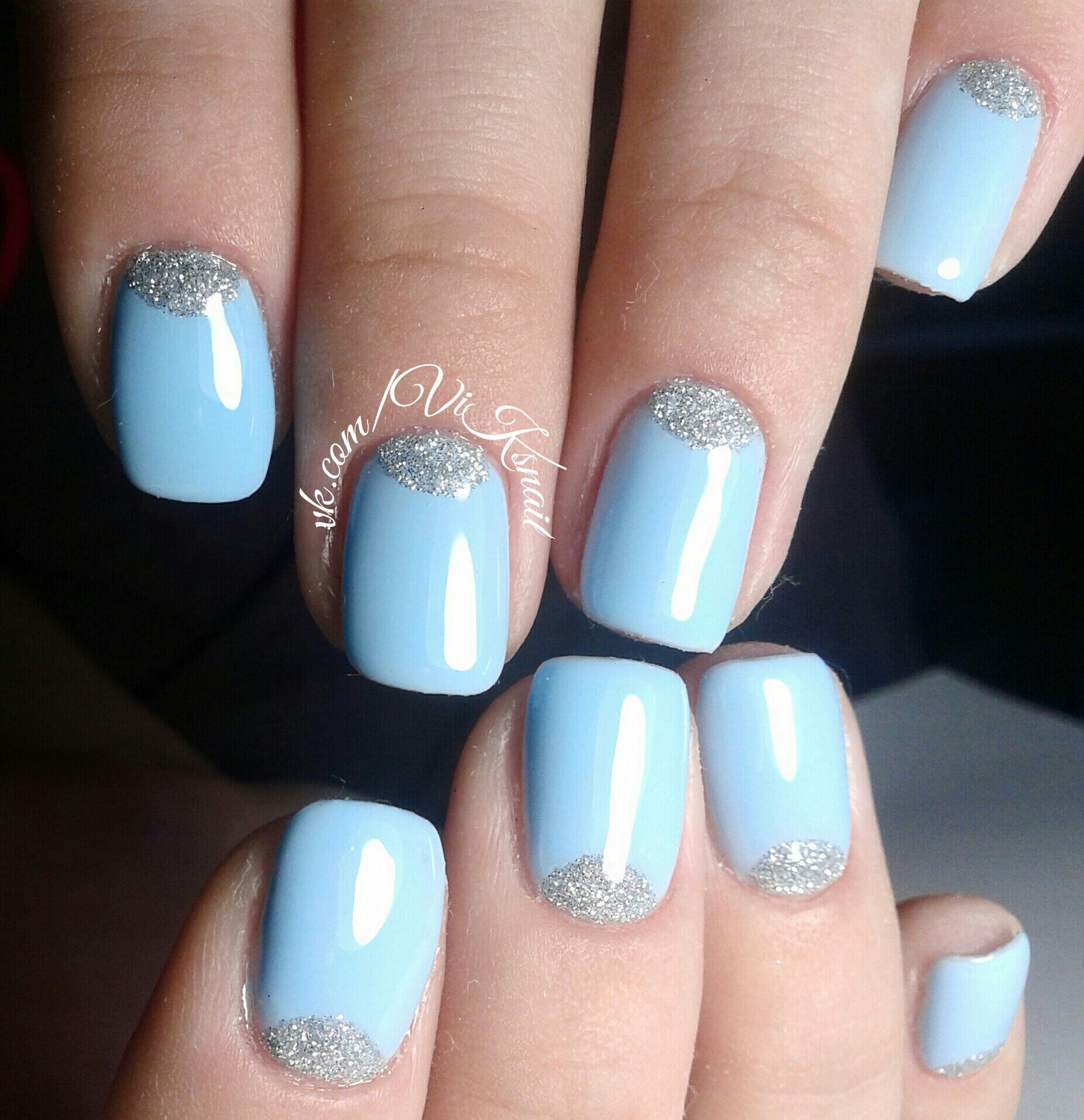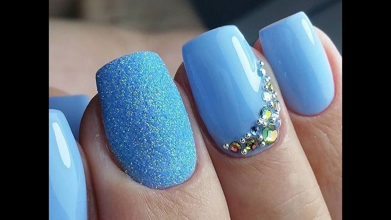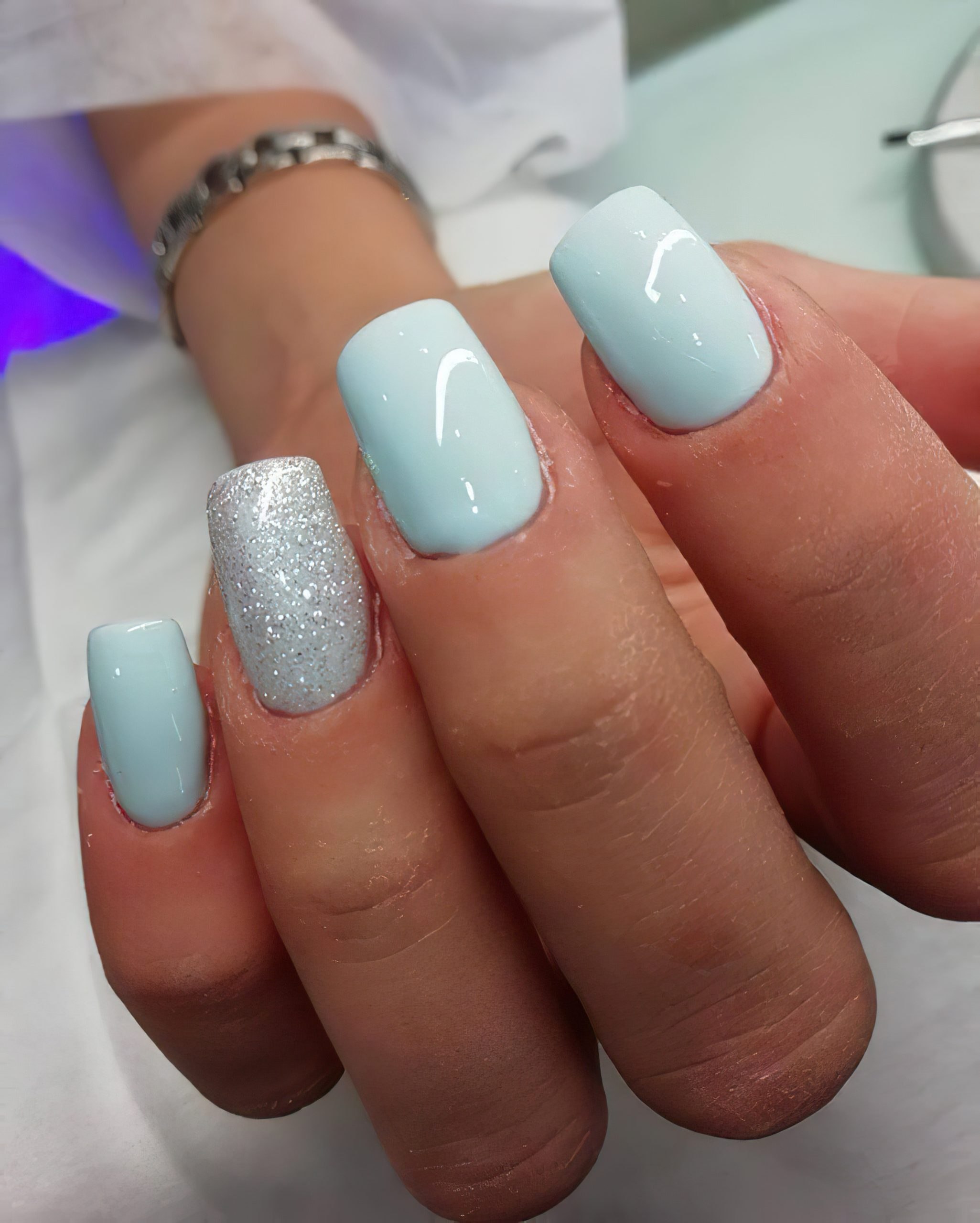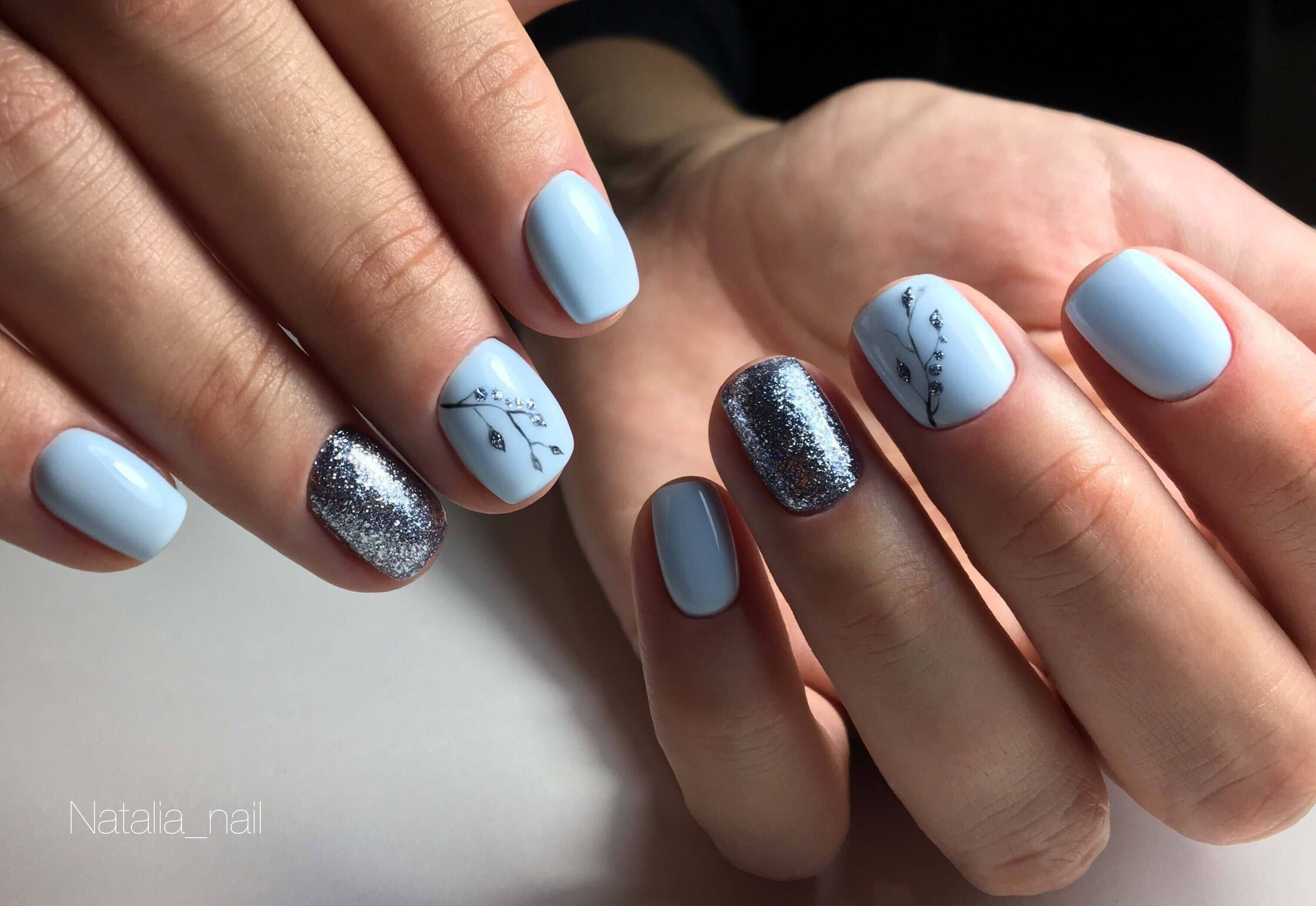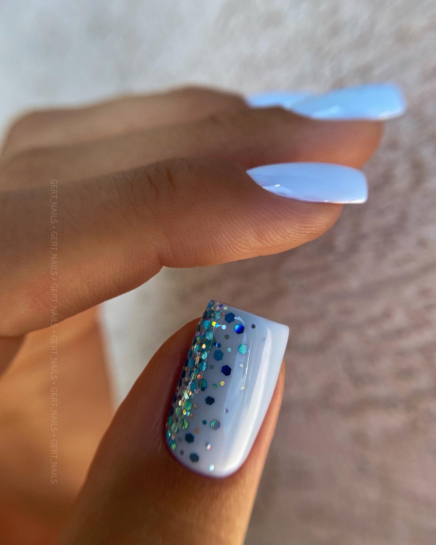 Маникюр дизайн нежный голубой с блестками (46 фото)