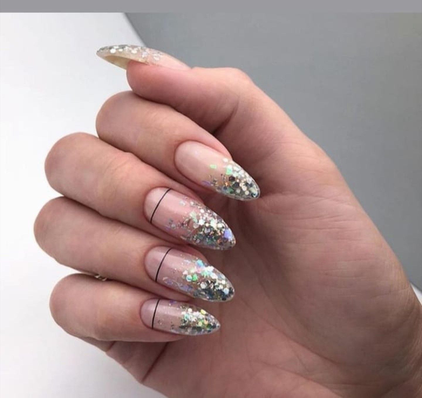 Нежный маникюр на миндалевидные ногти с блестками