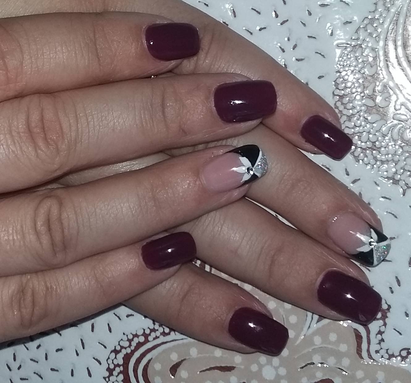 Маникюр френч бордовый с серебром
