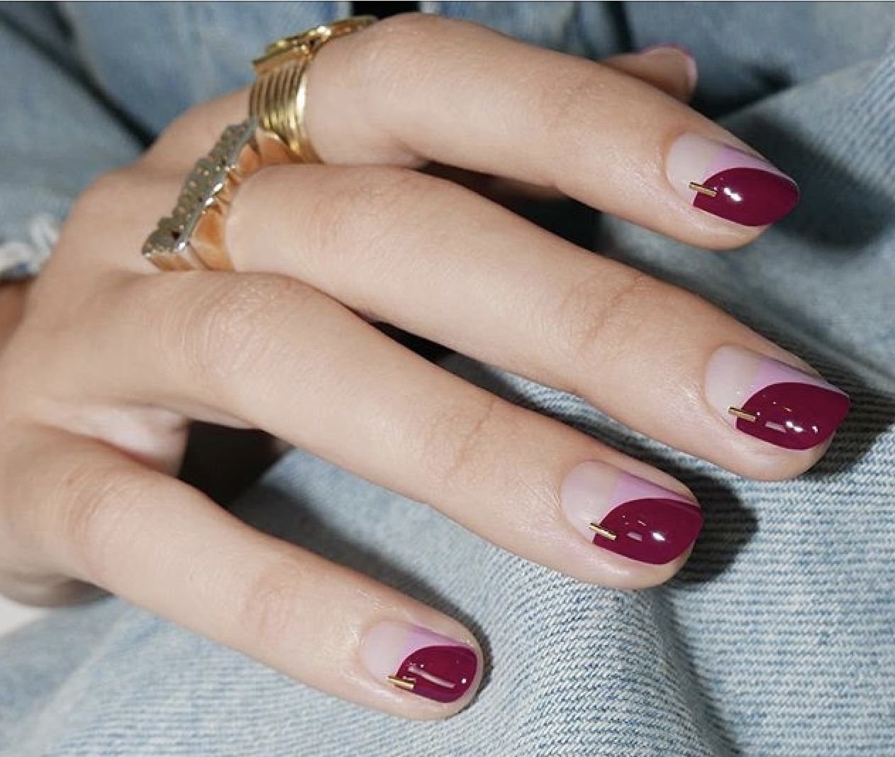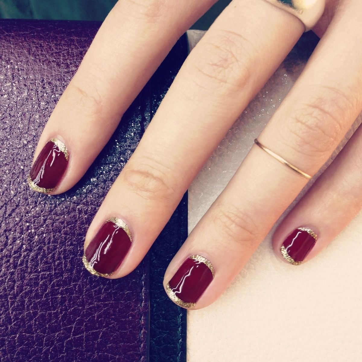Маникюр бордо с золотым френчем на коротких ногтях