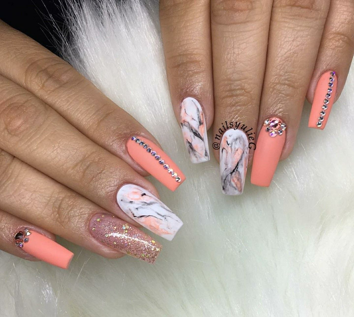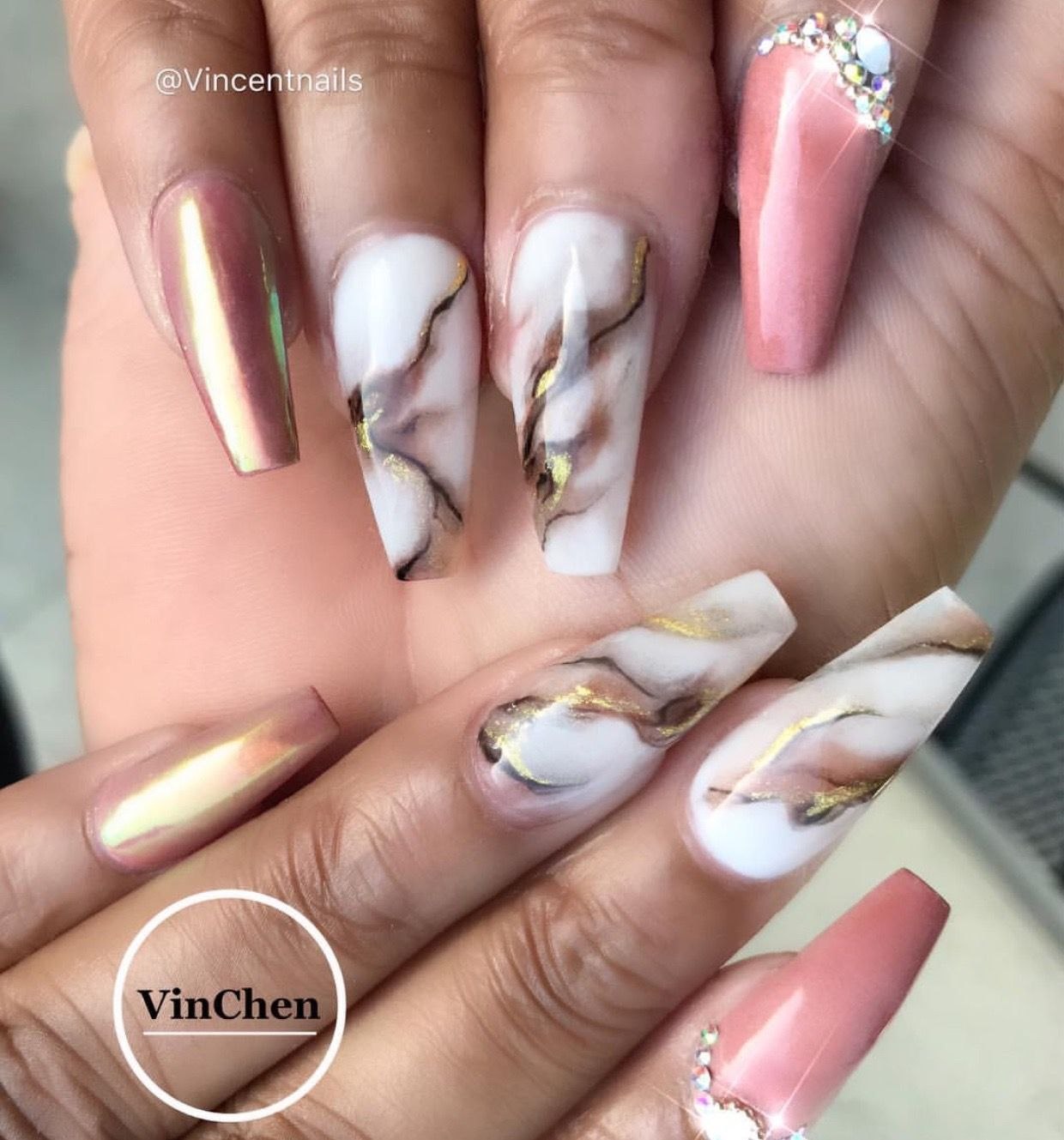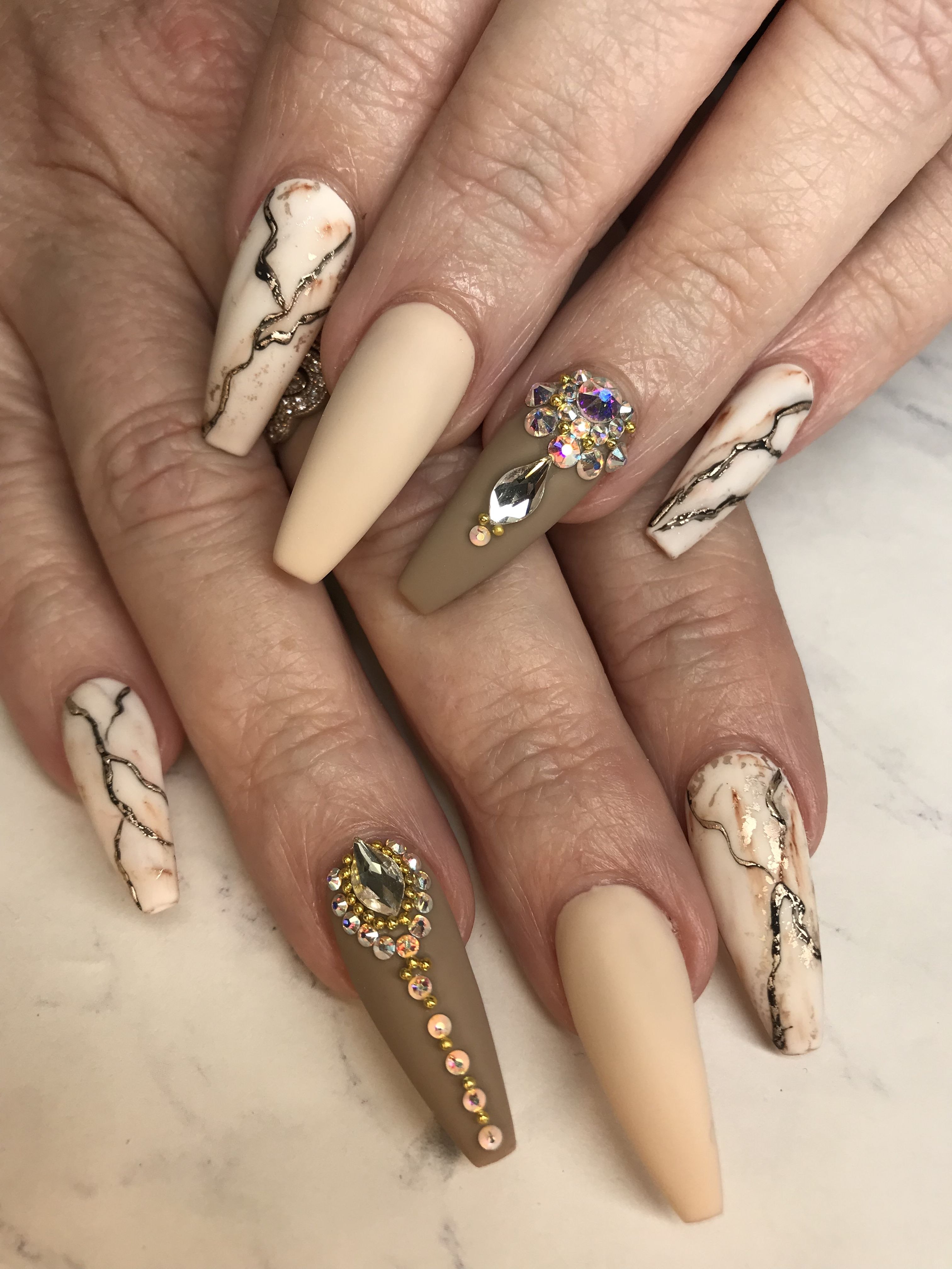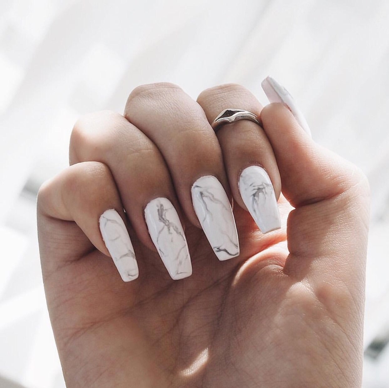 Мраморный маникюр на острых ногтях