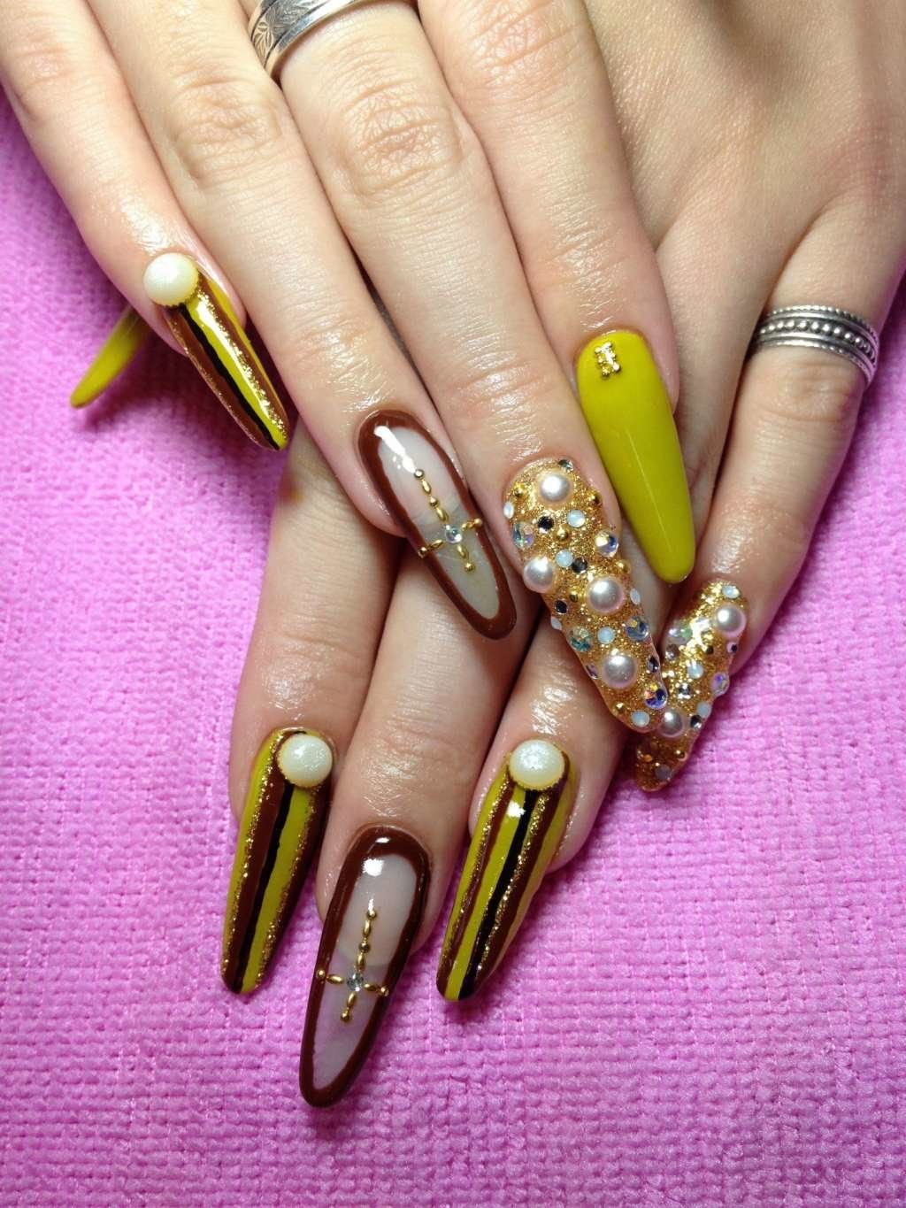Острые ногти коричневые с золотом