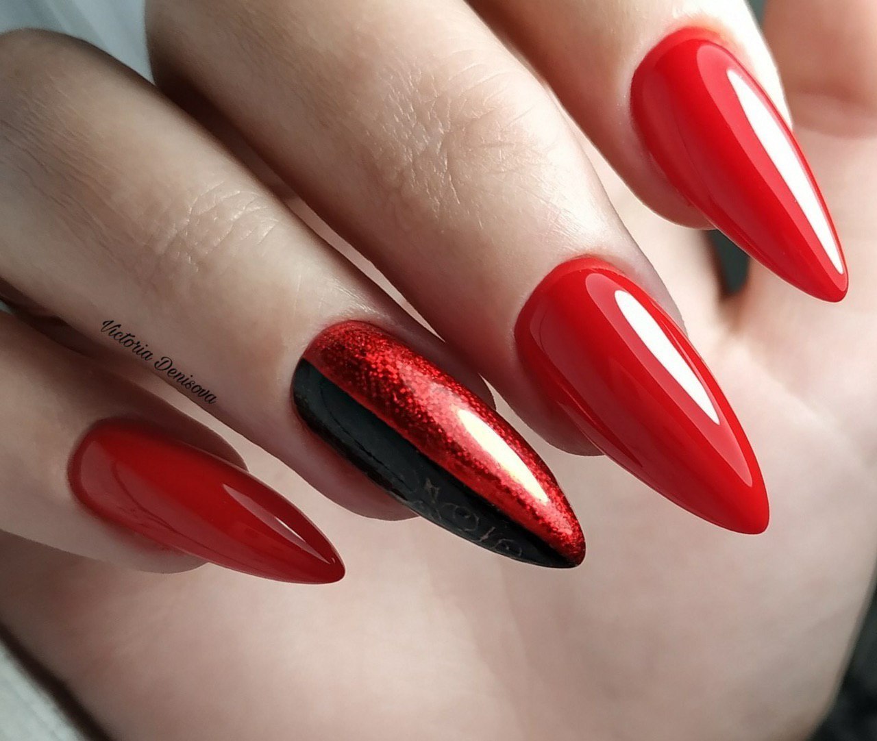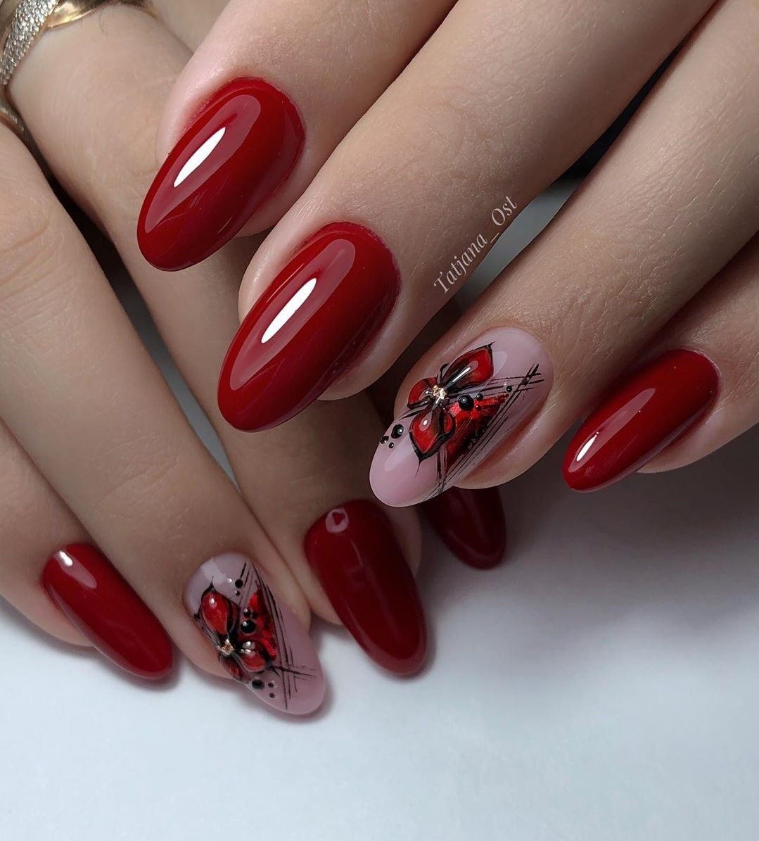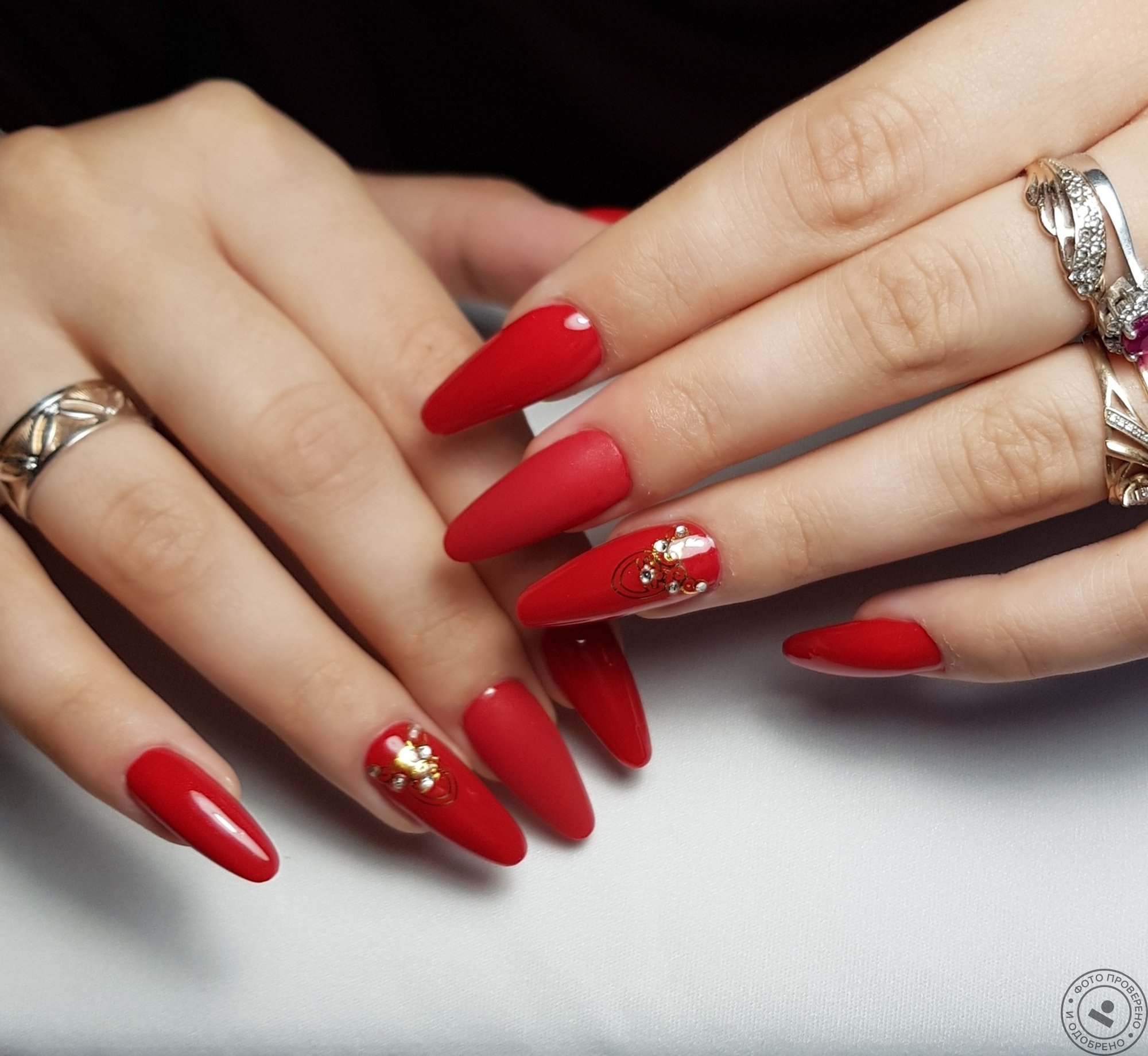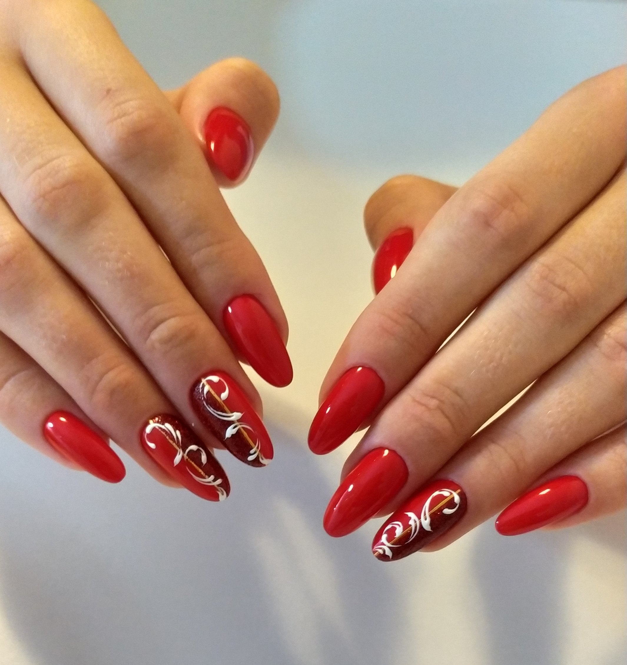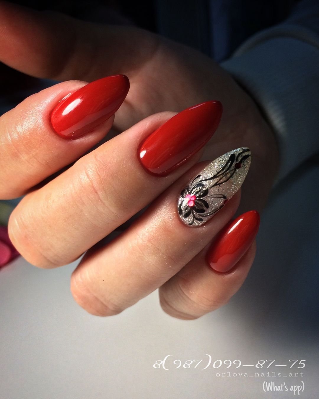 Красные ногти маникюр миндаль с дизайном (27 фото)