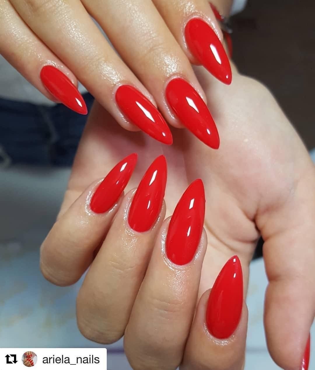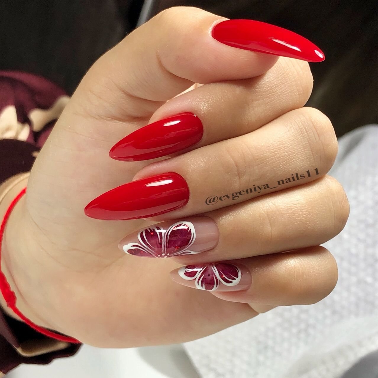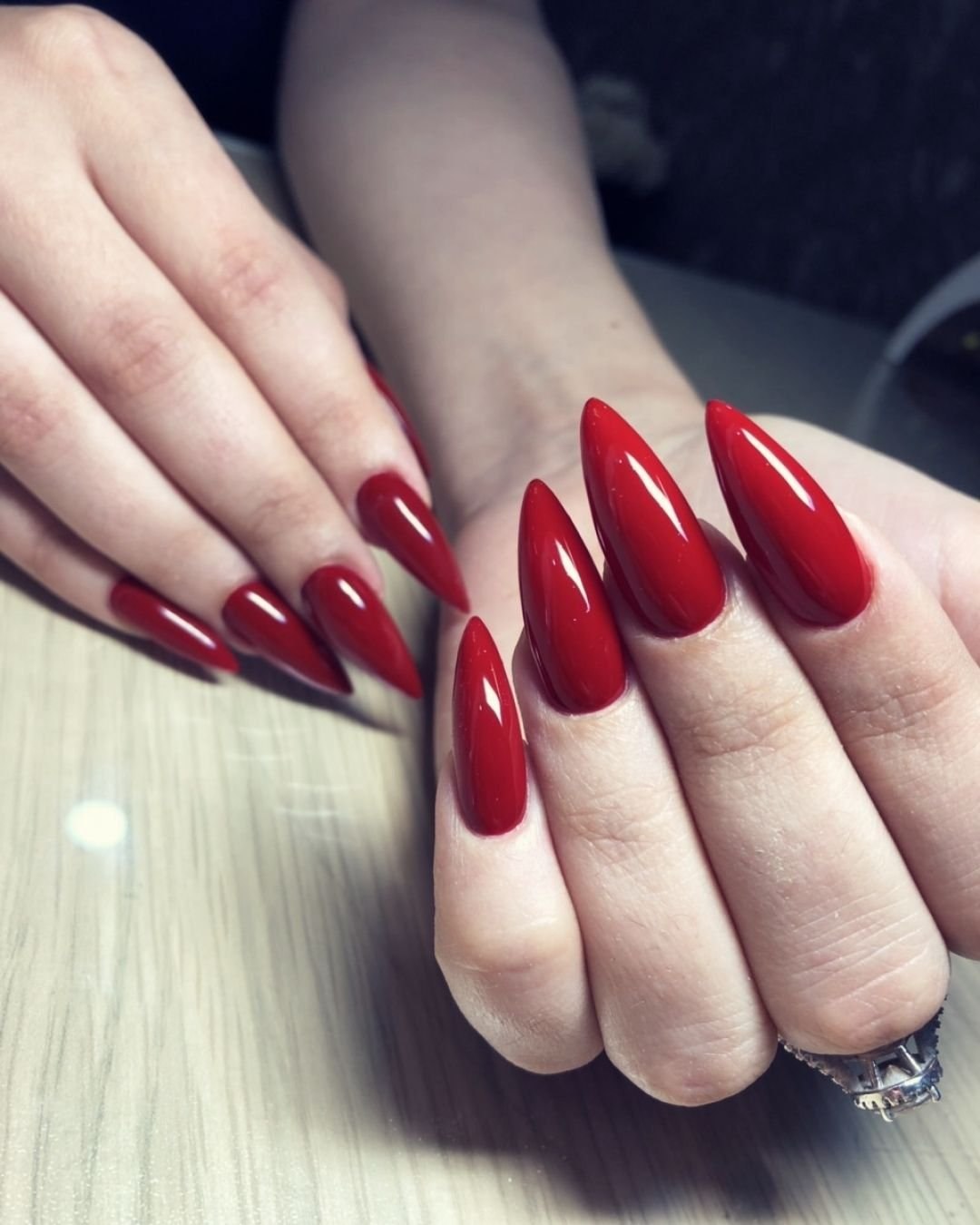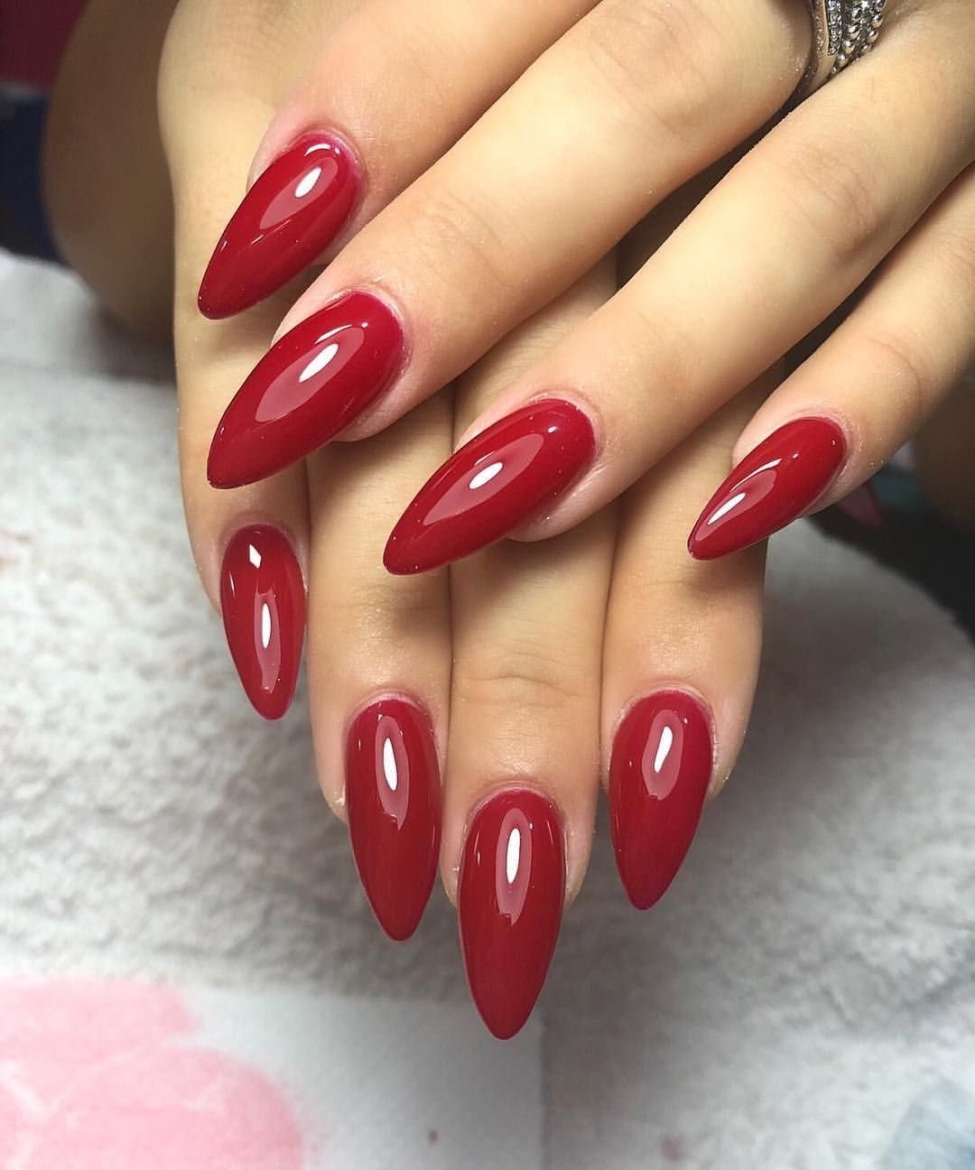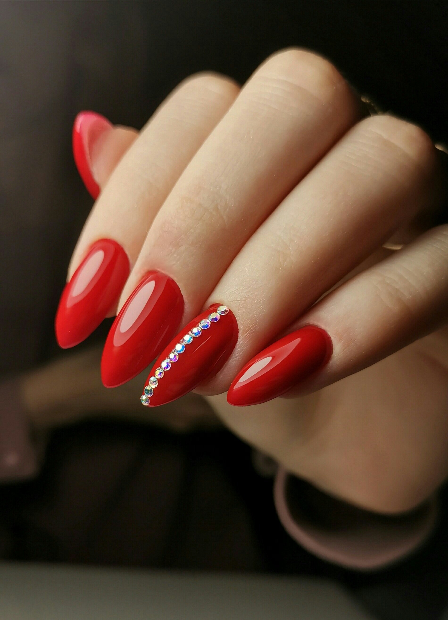 Красный маникюр на длинные ногти миндалевидной формы (31 фото)