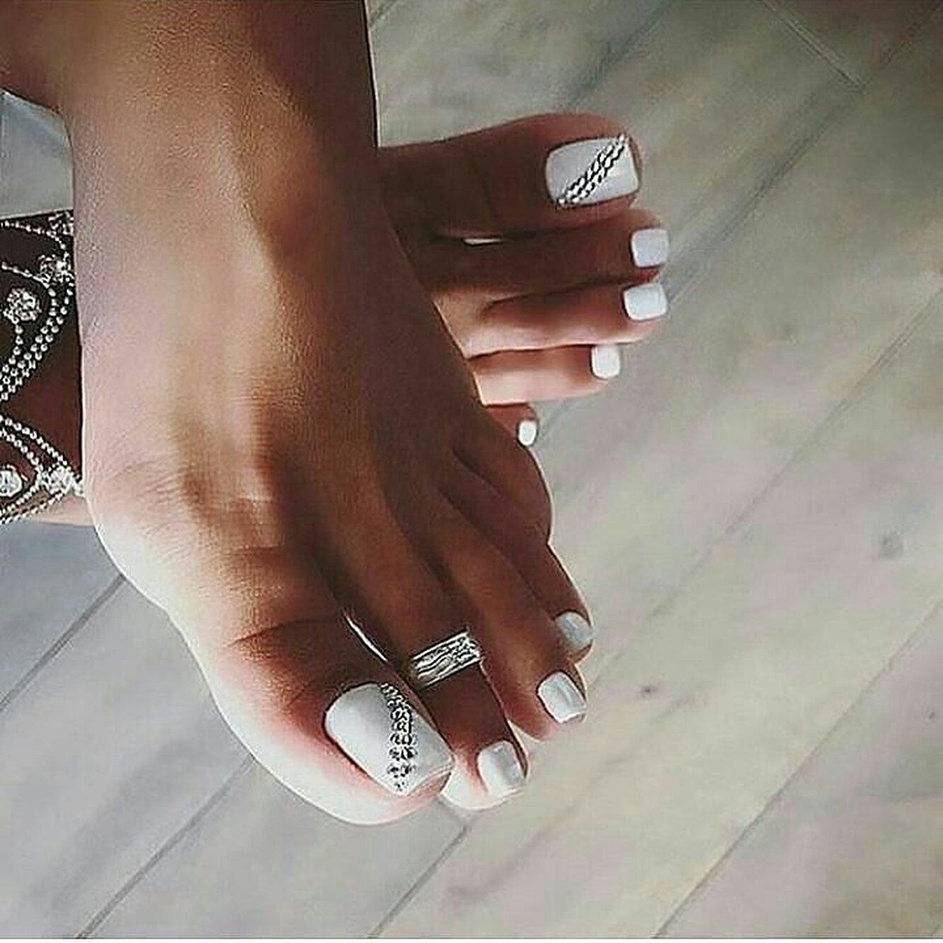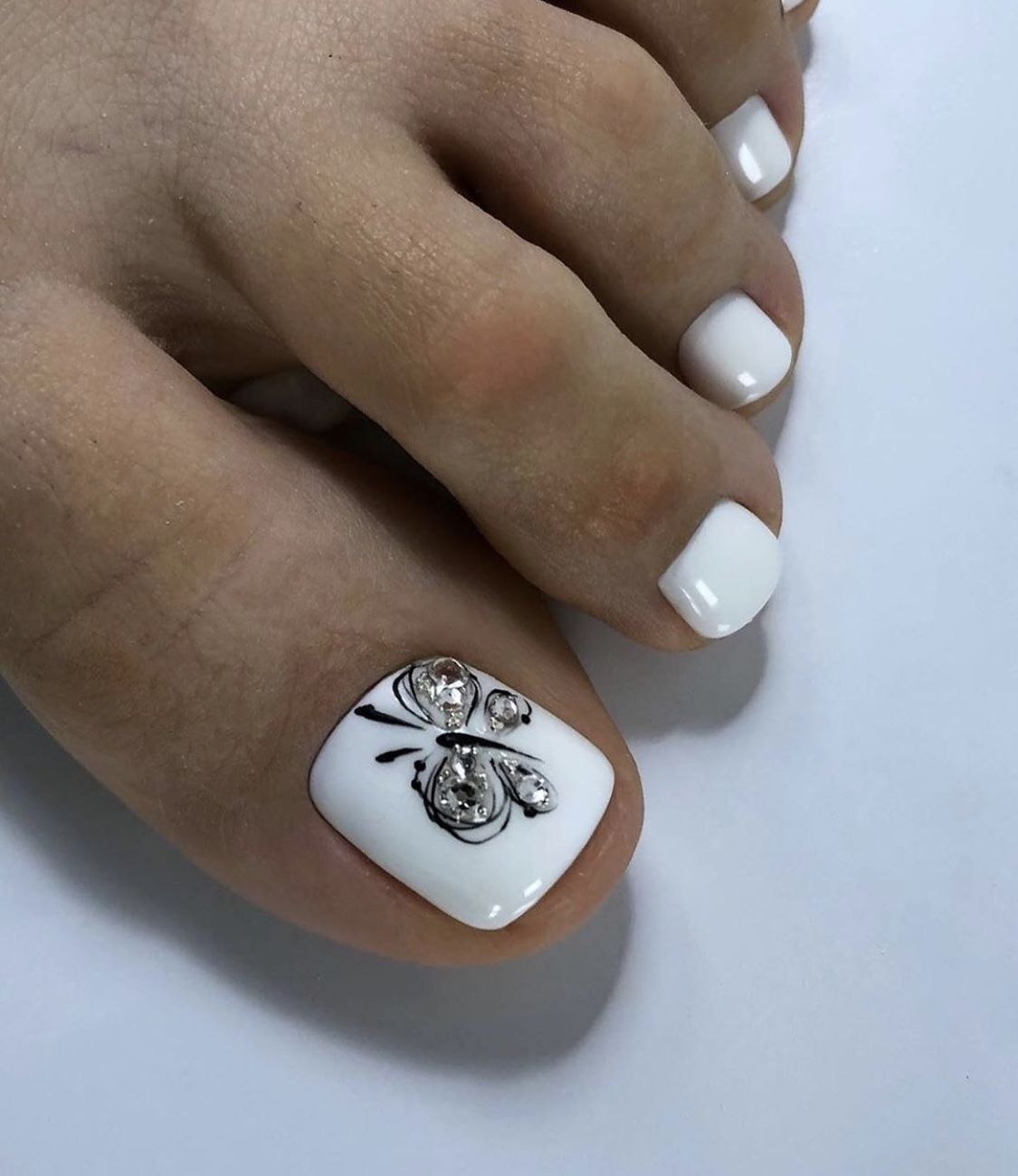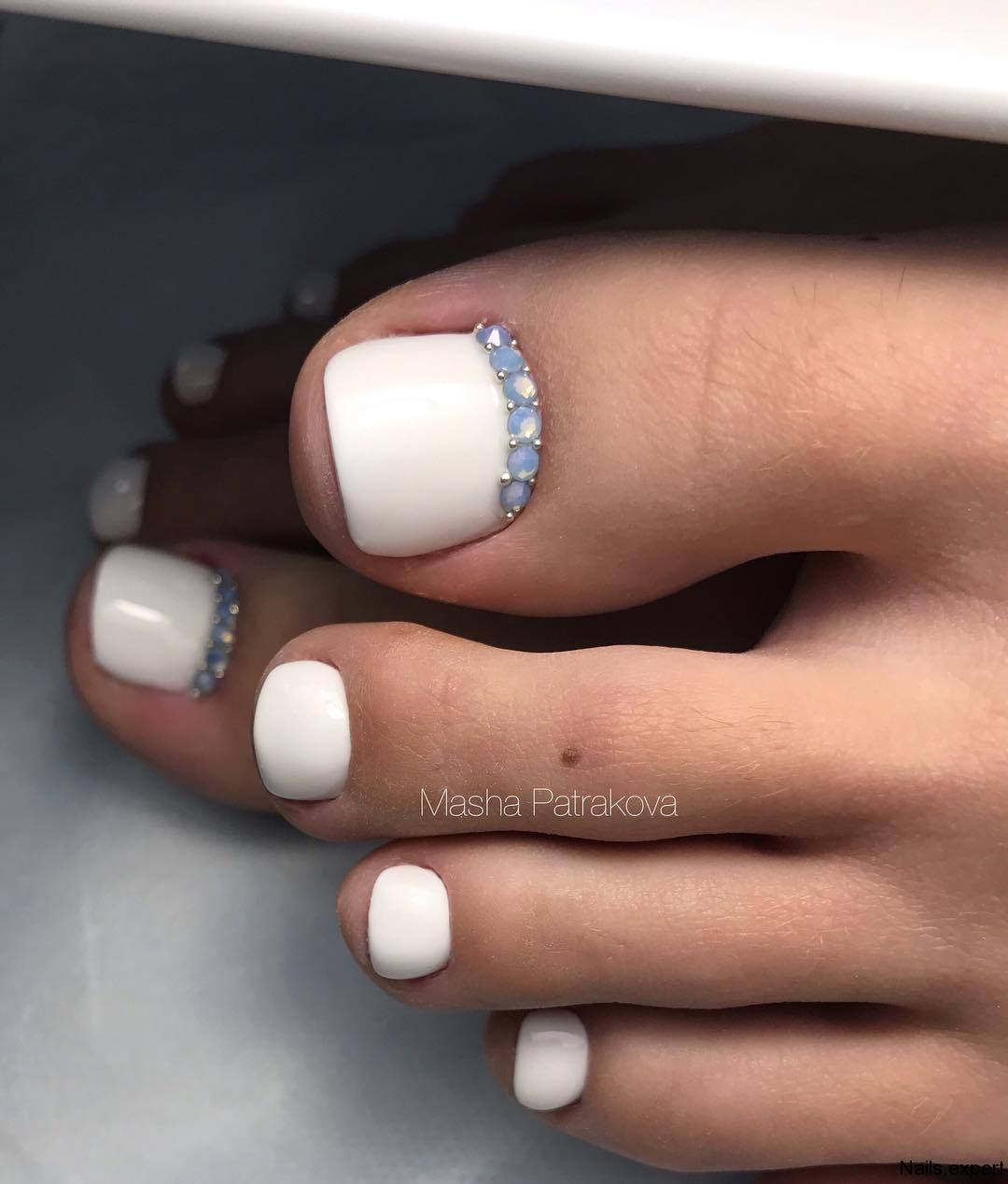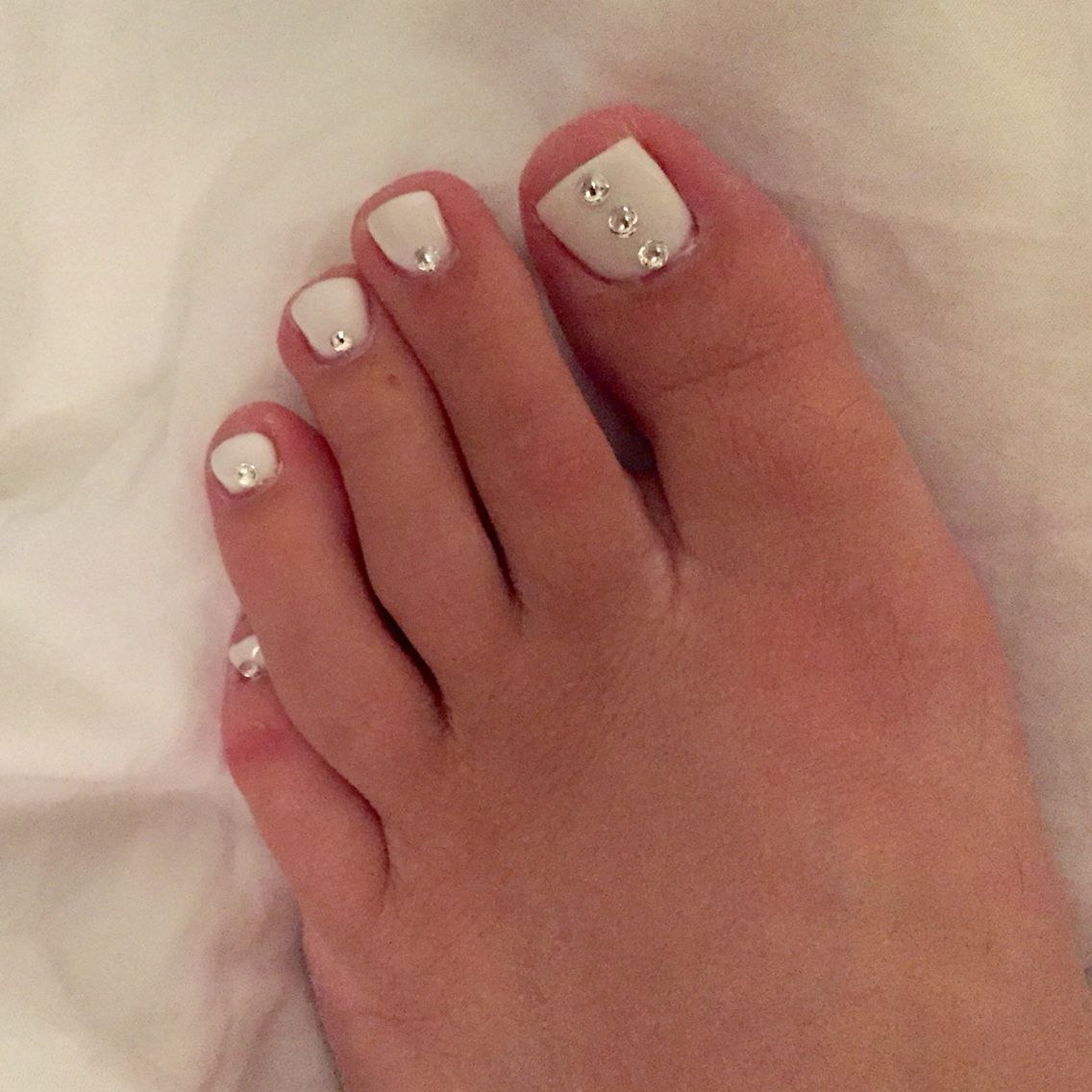 Белый педикюр со стразами