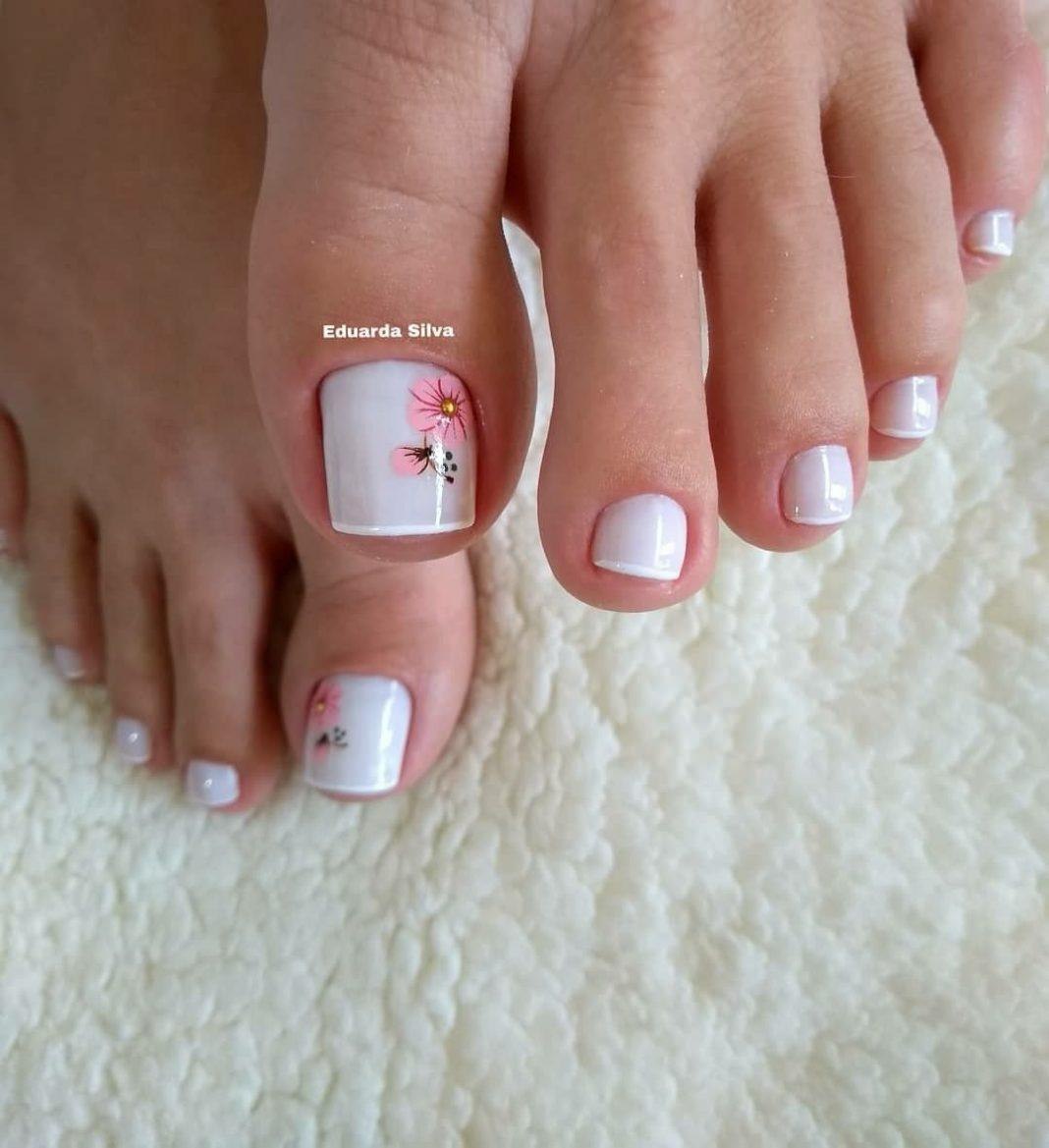 Белый педикюр с цветами