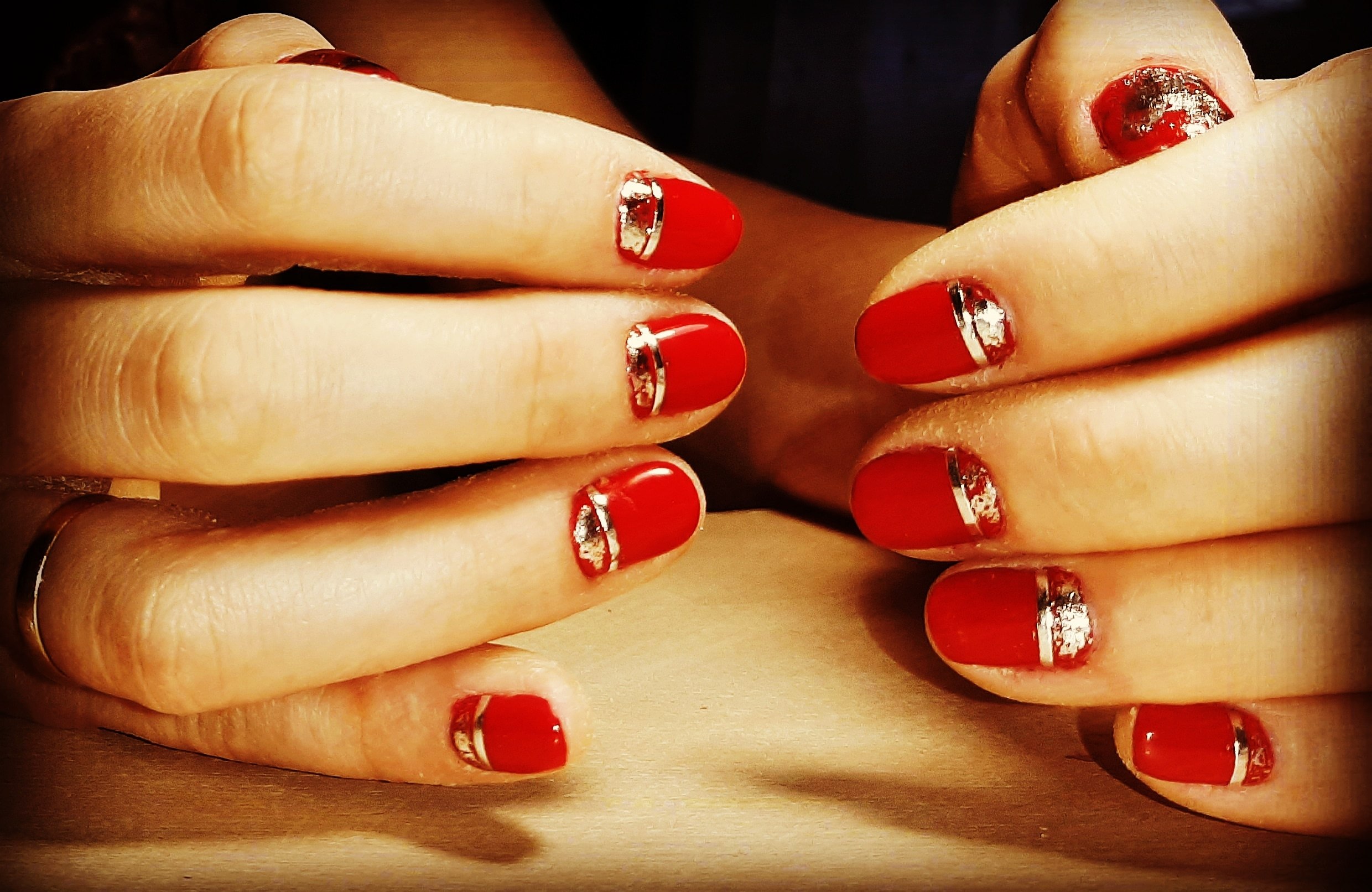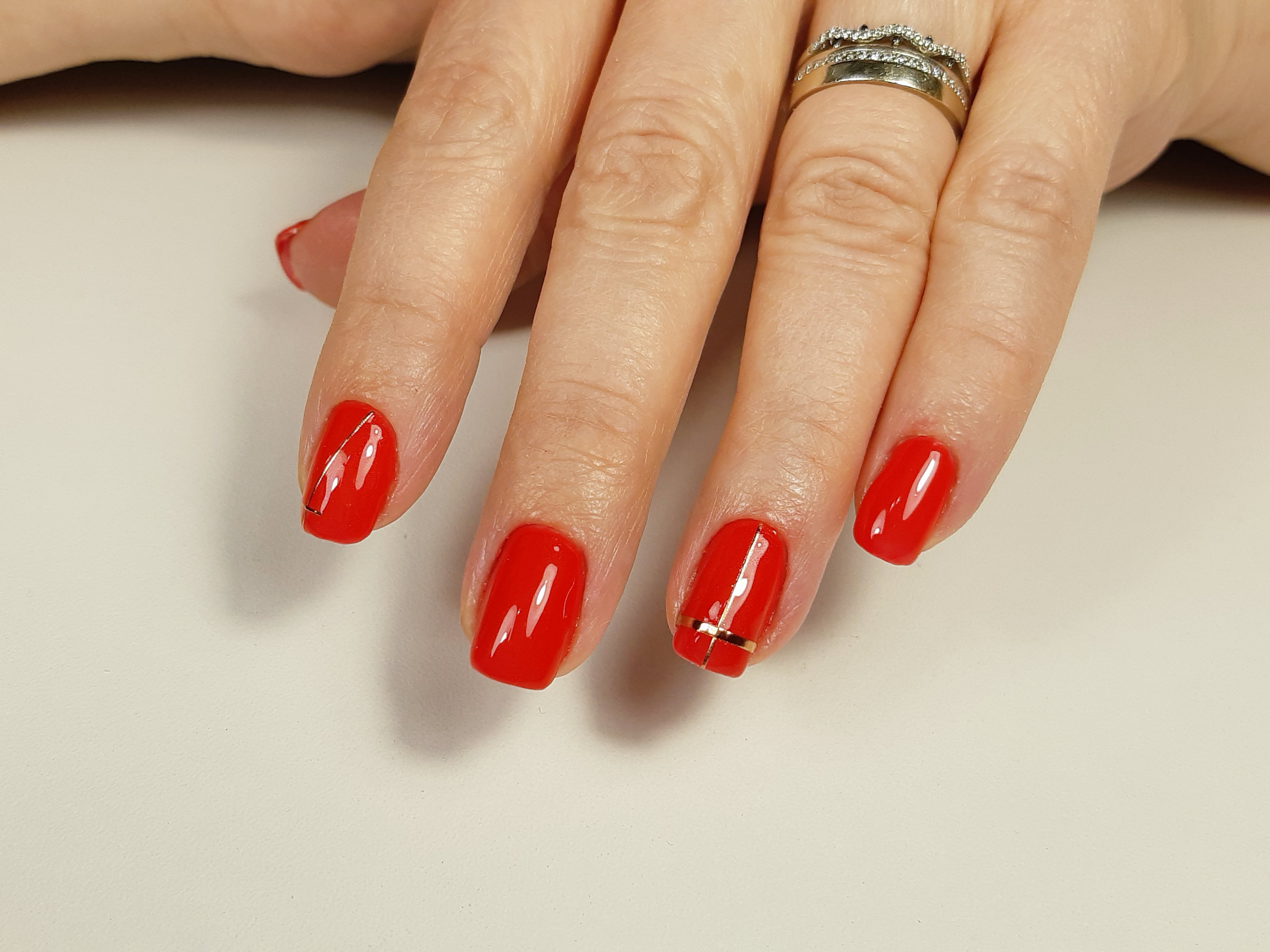 Красный маникюр с золотыми полосками
