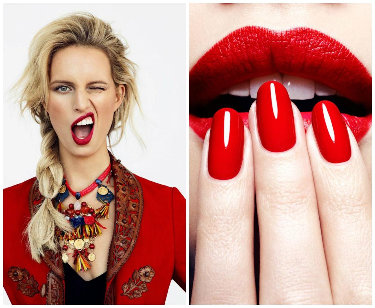 Сочетание красных ногтей и красной помады под одежду