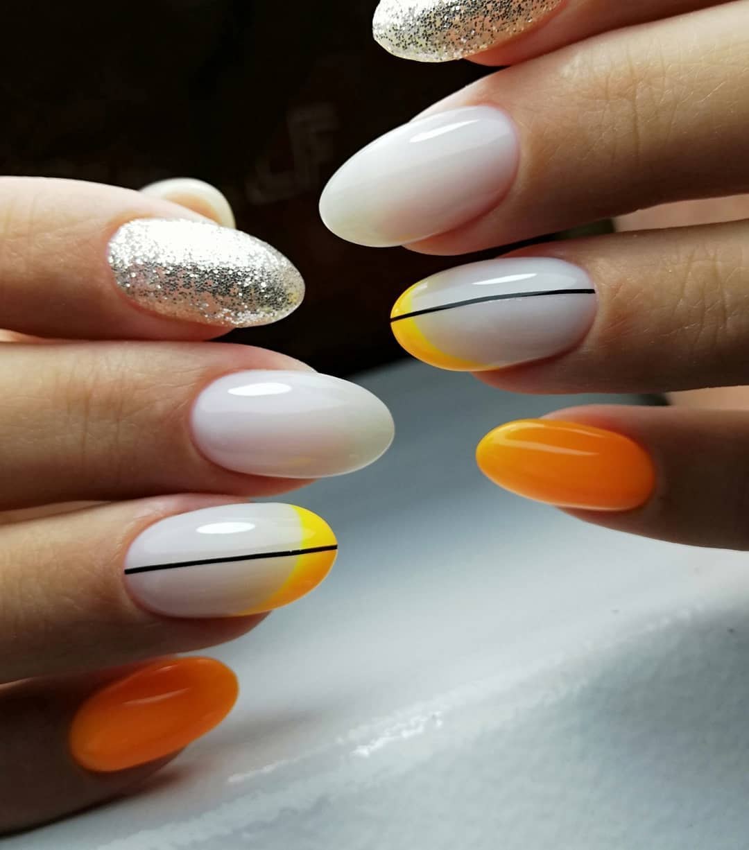 Оранжевый маникюр с полосками