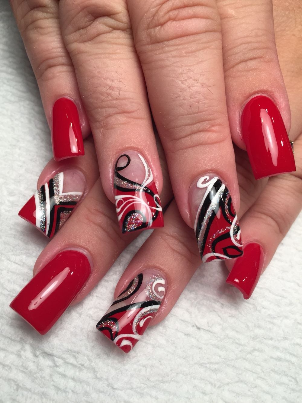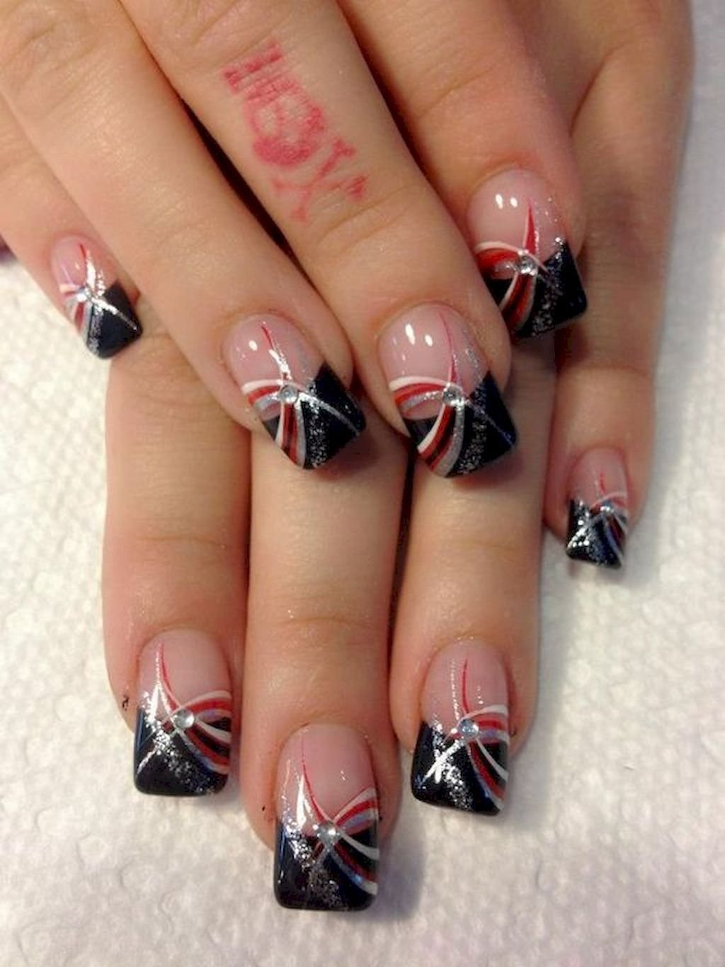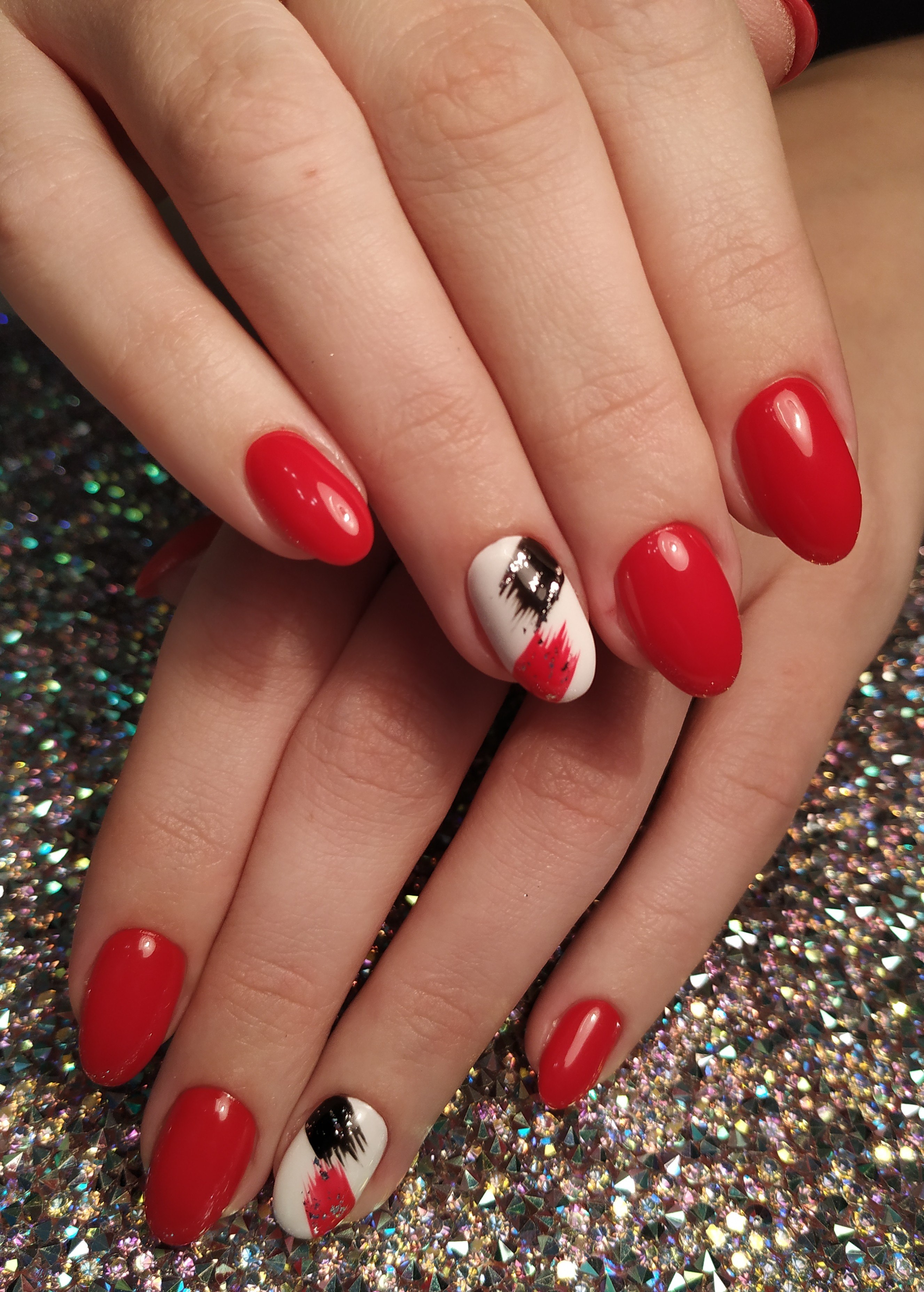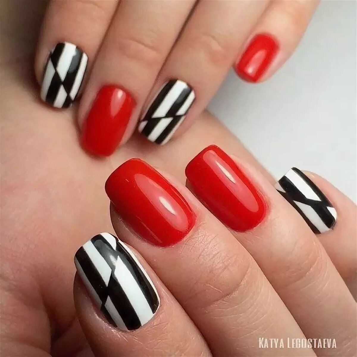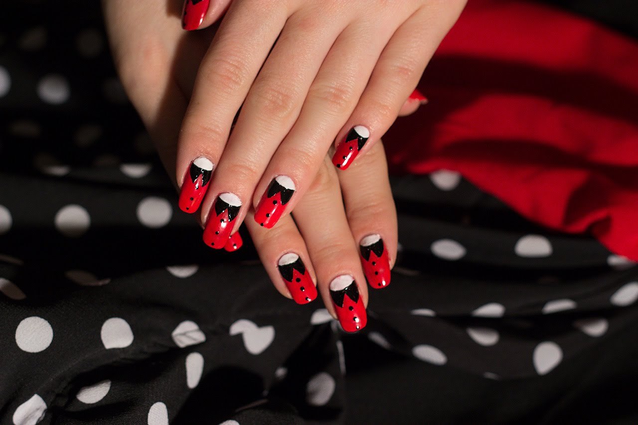 Ногти красные с черным и белым