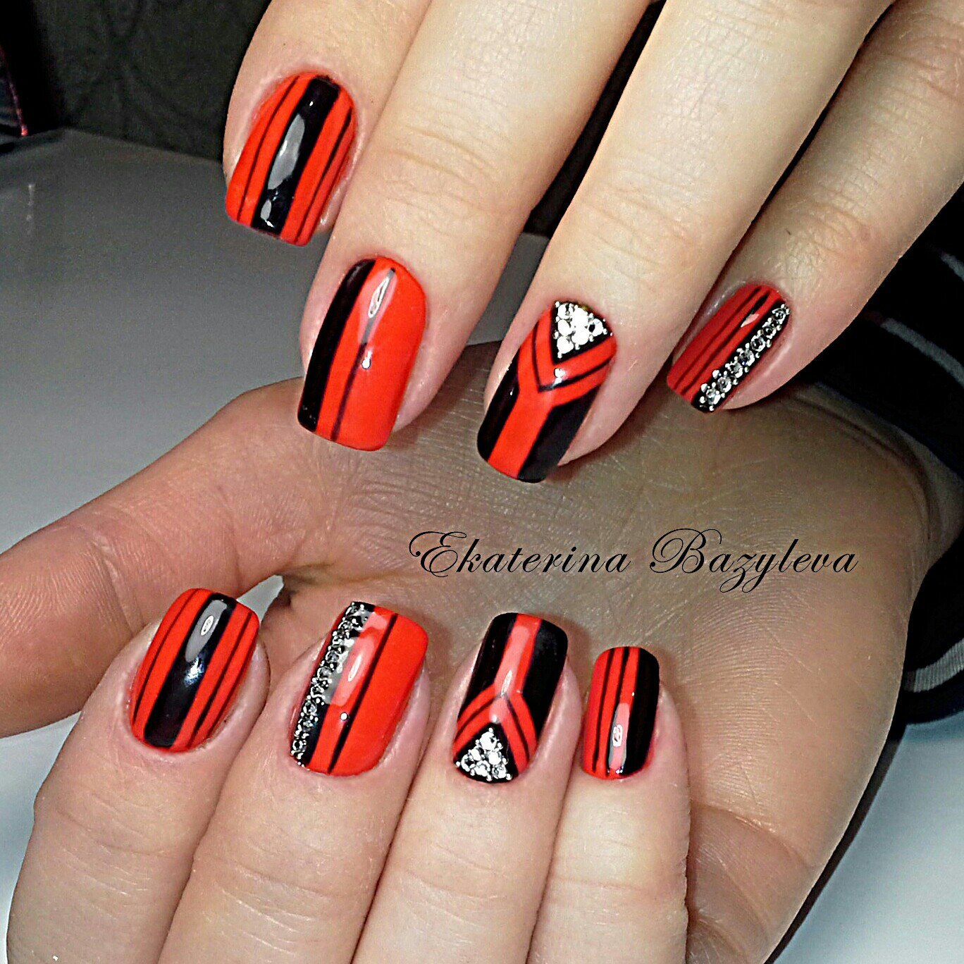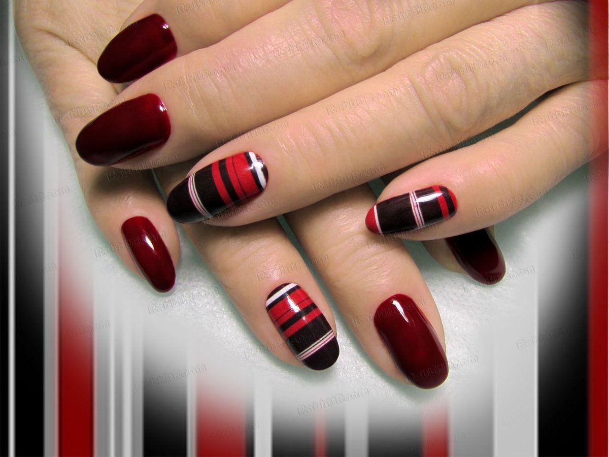 Красный маникюр с черными полосками