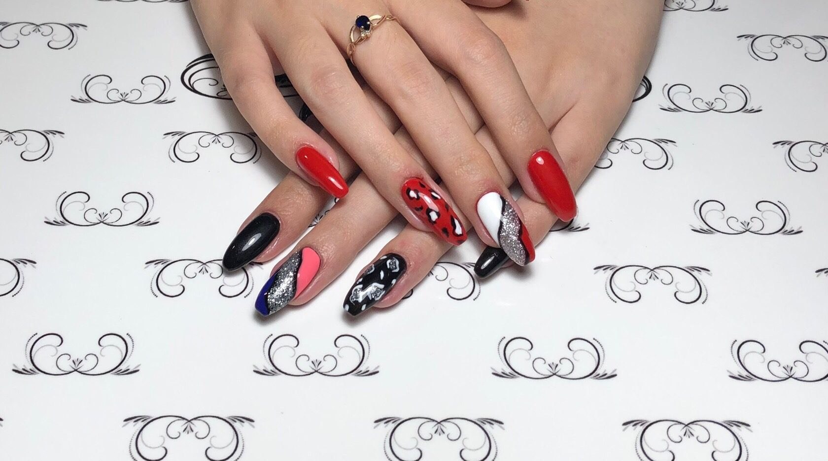 Маникюр красный с черным и белым