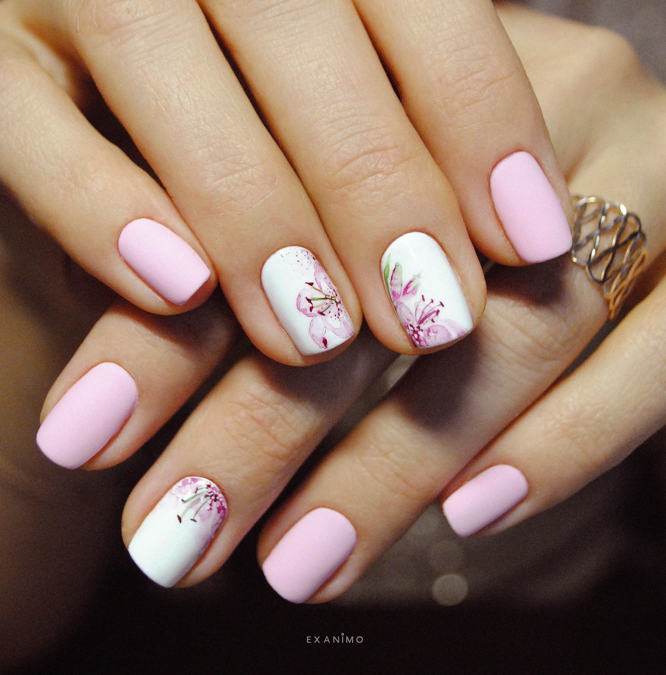 Маникюр нюдовый с розовым рисунком