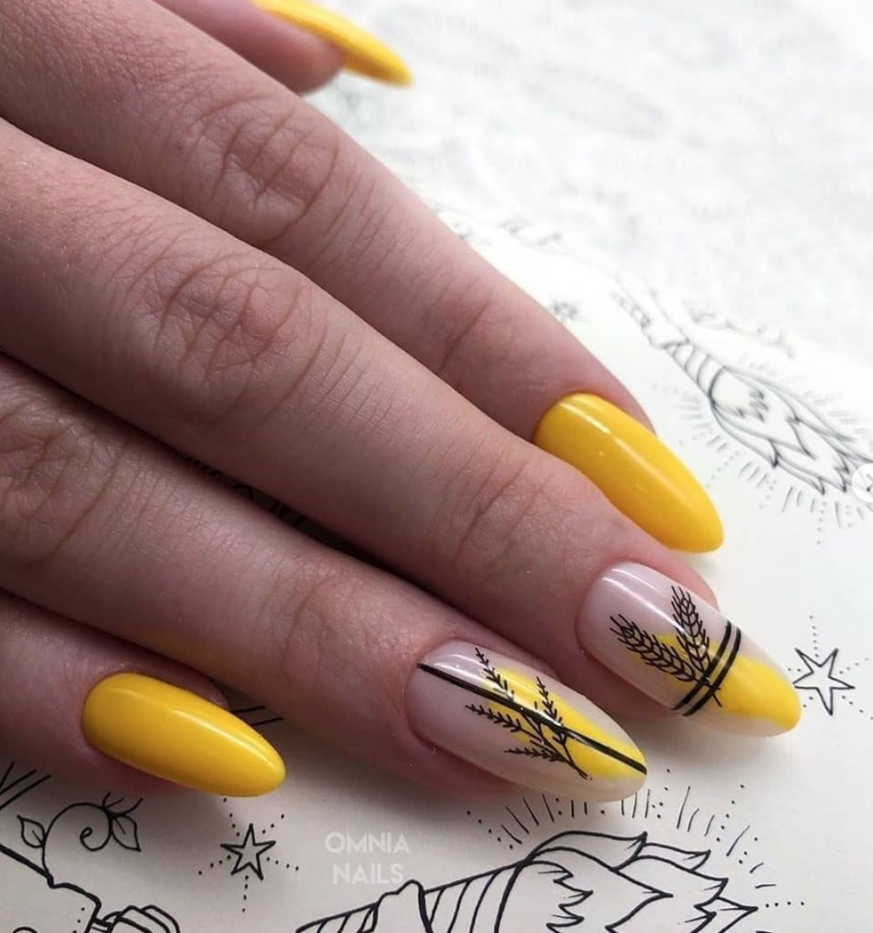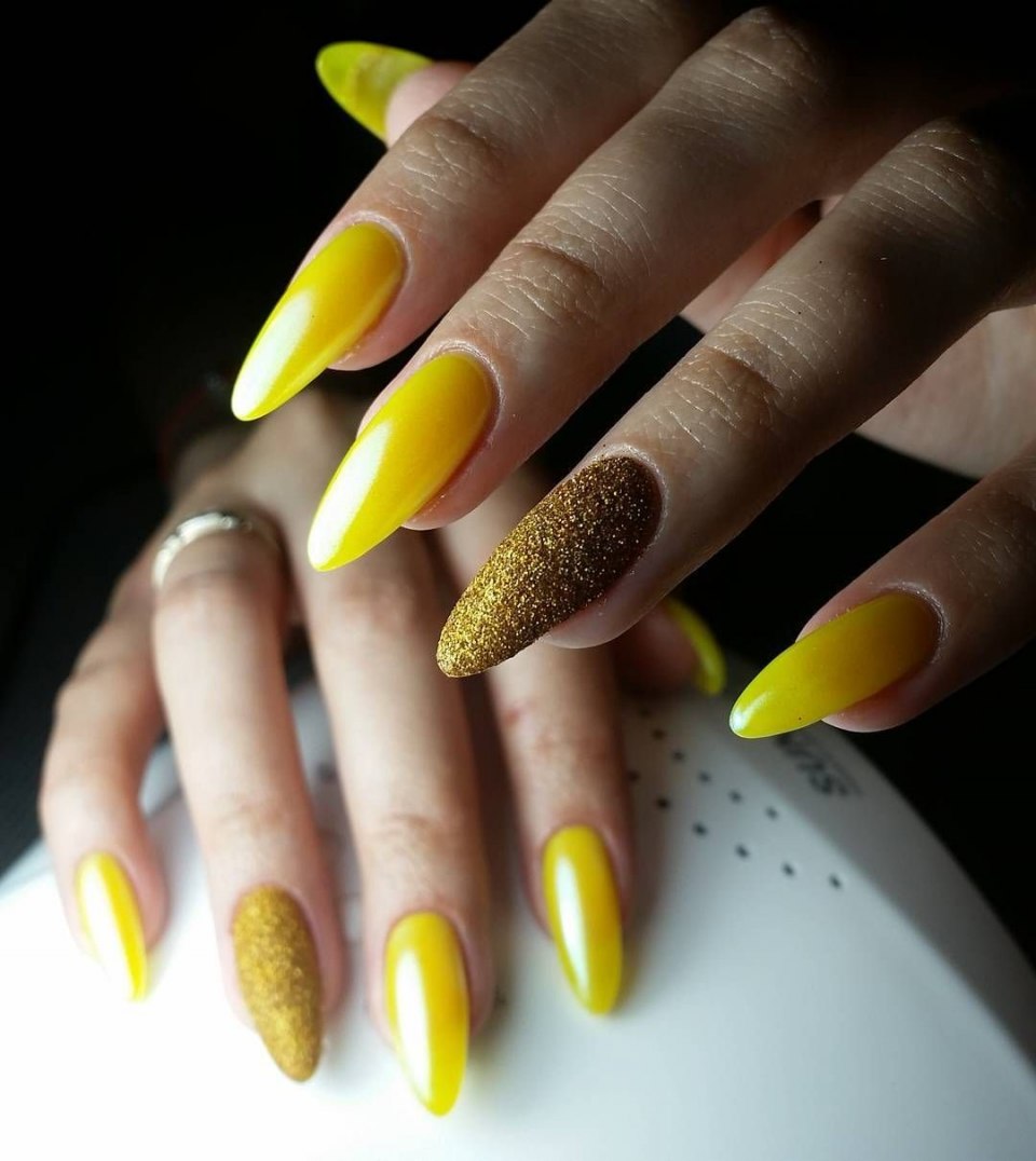 Желтый маникюр со стразами на форму миндаль (41 фото)