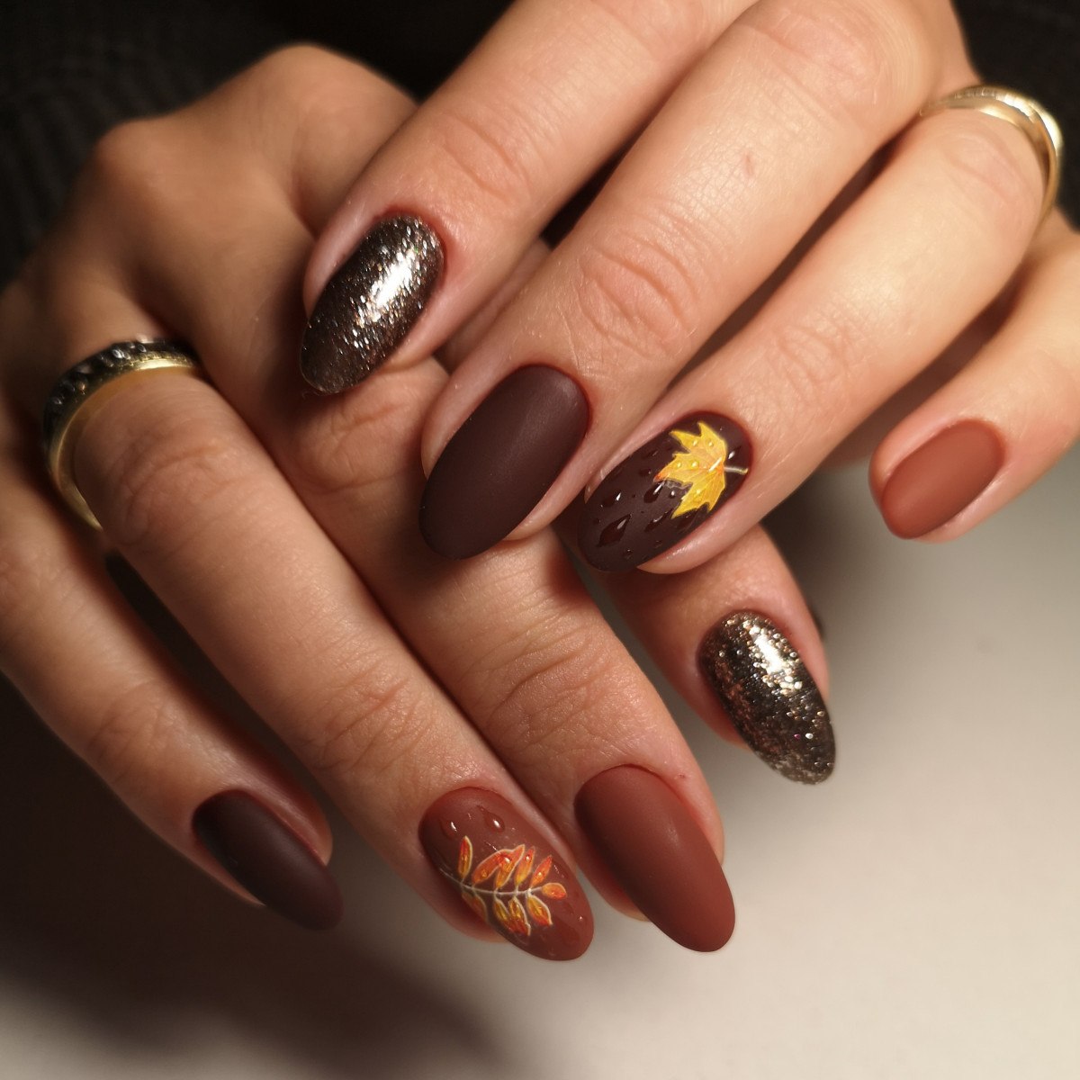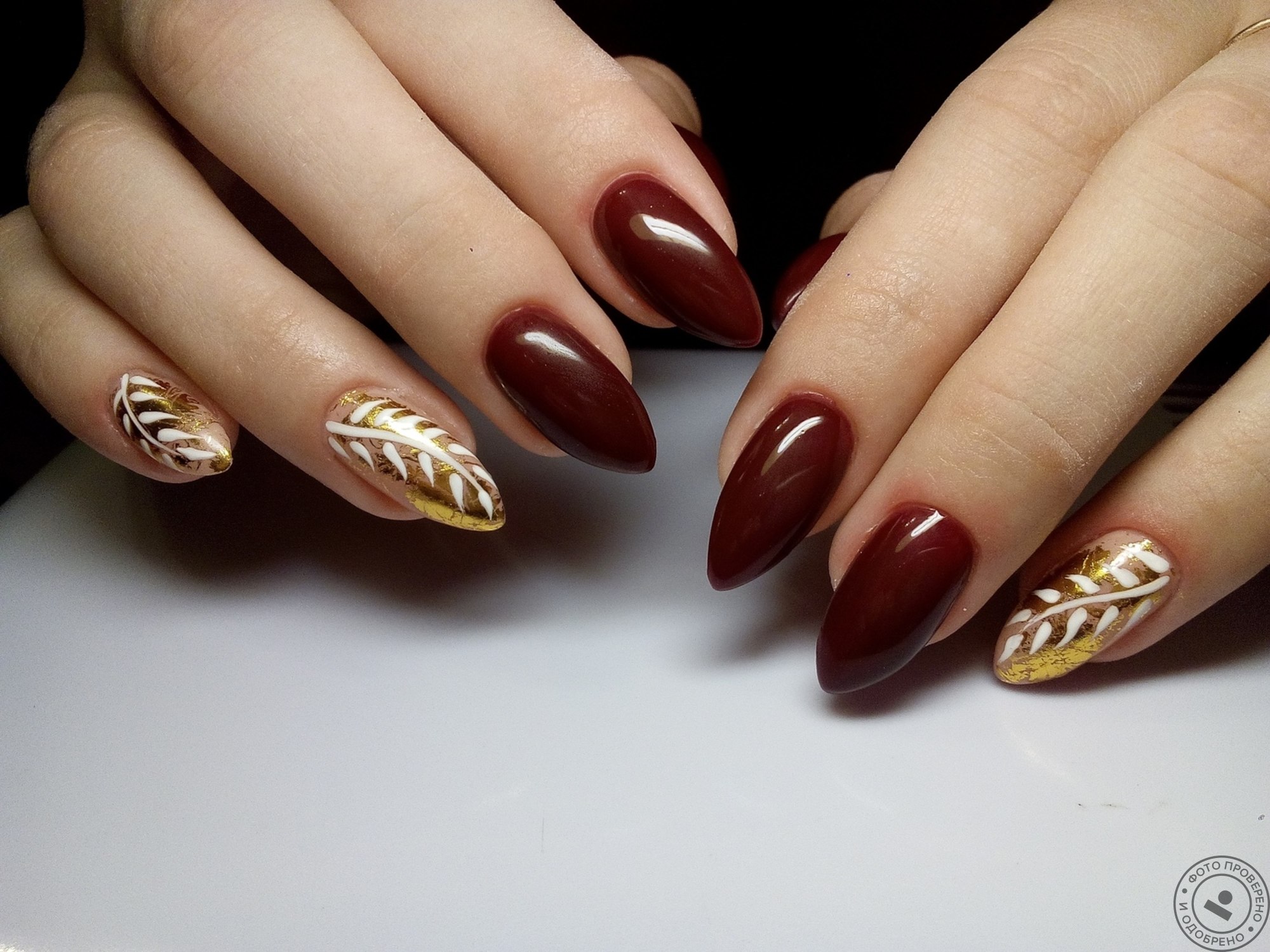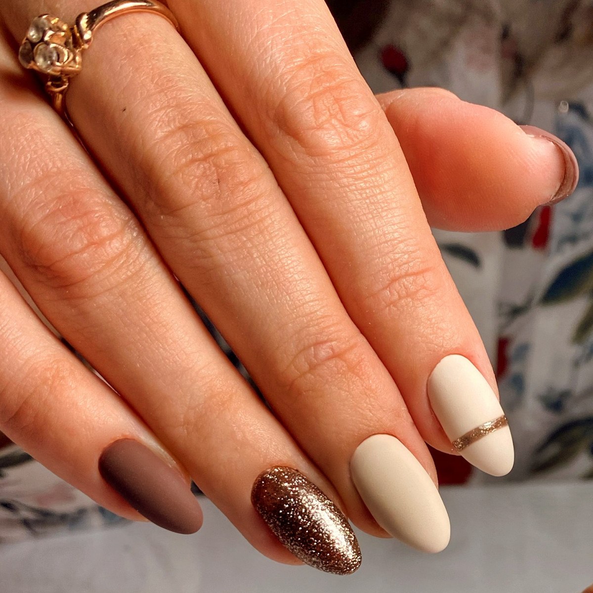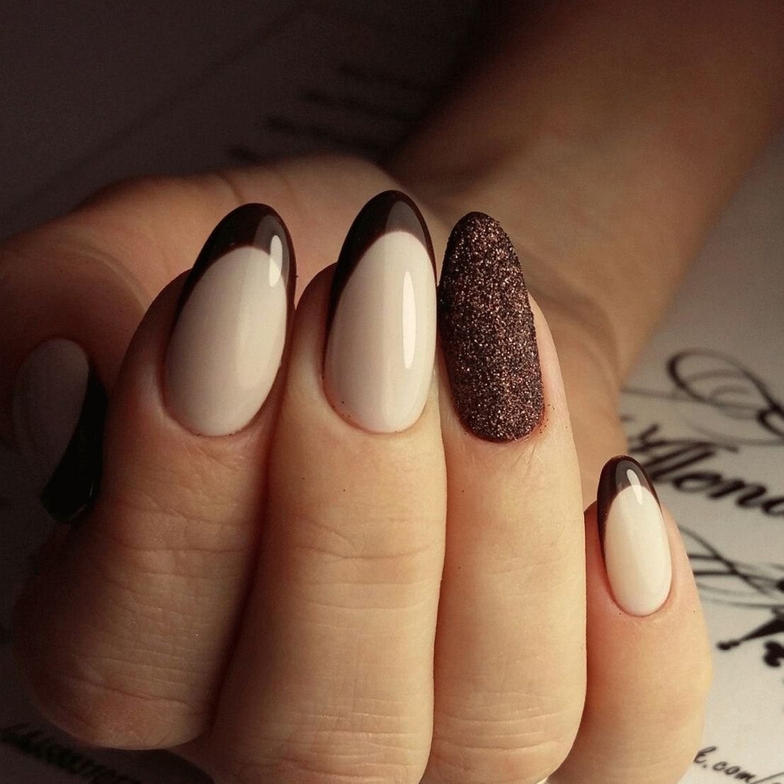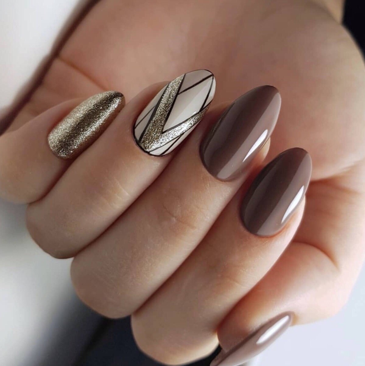 Коричневый маникюр с золотом на миндалевидных ногтях (43 фото)