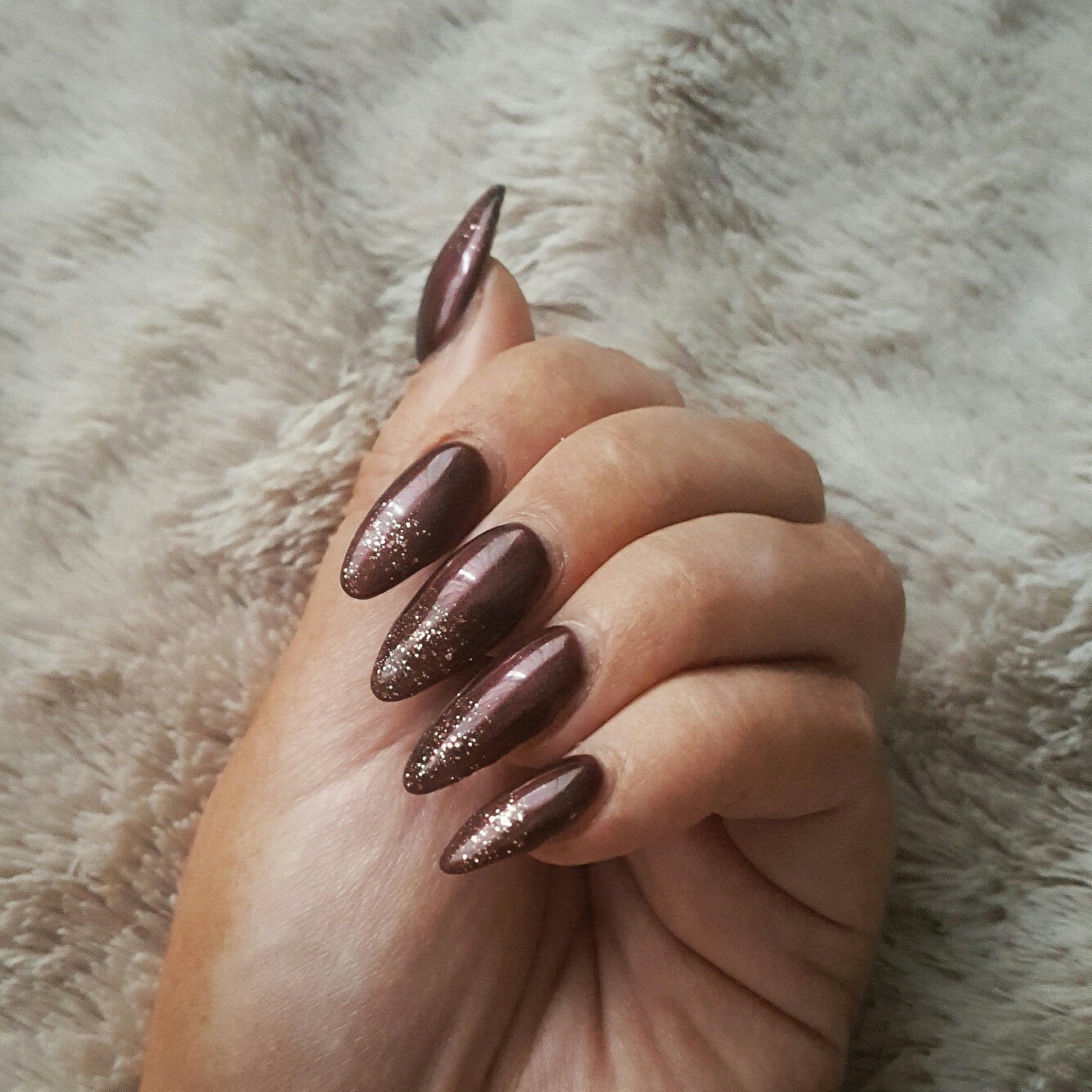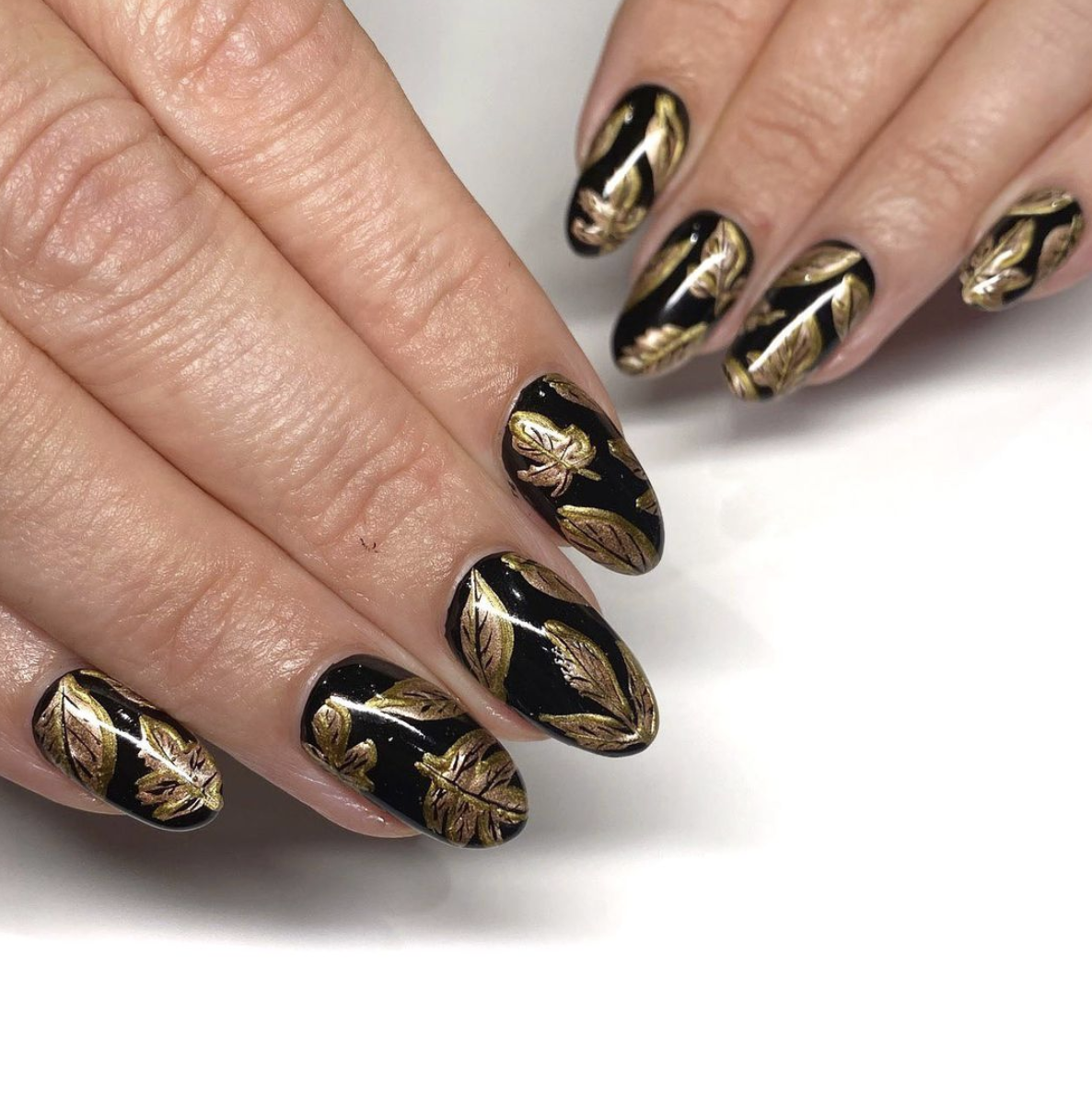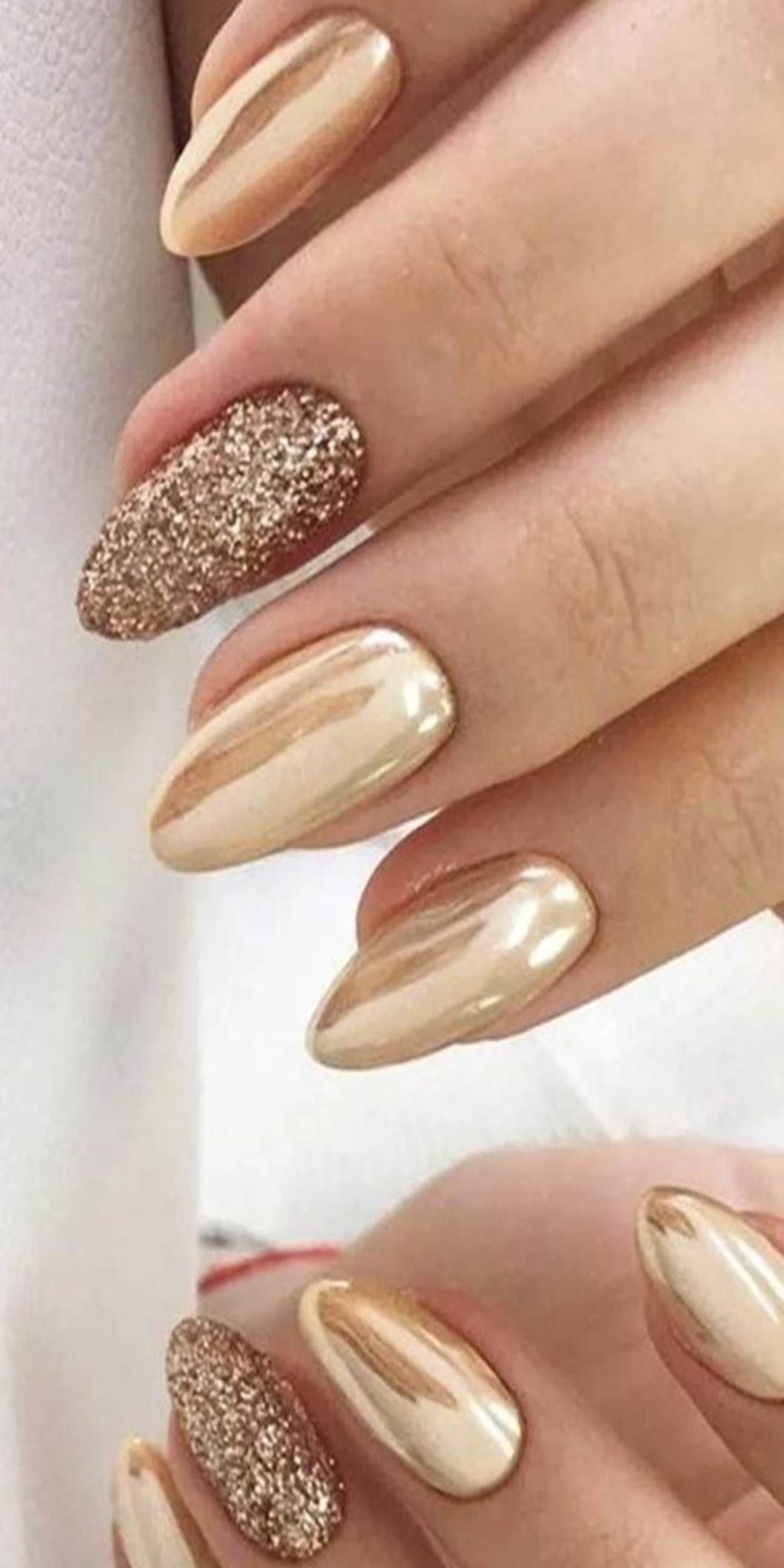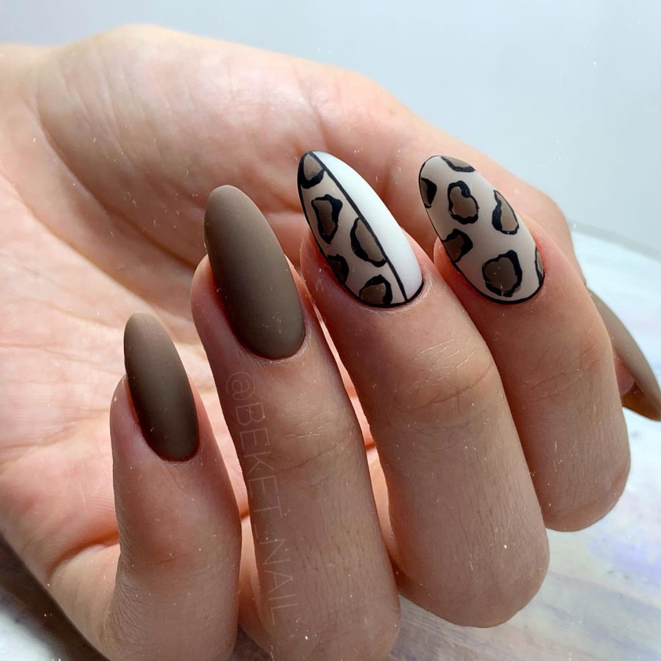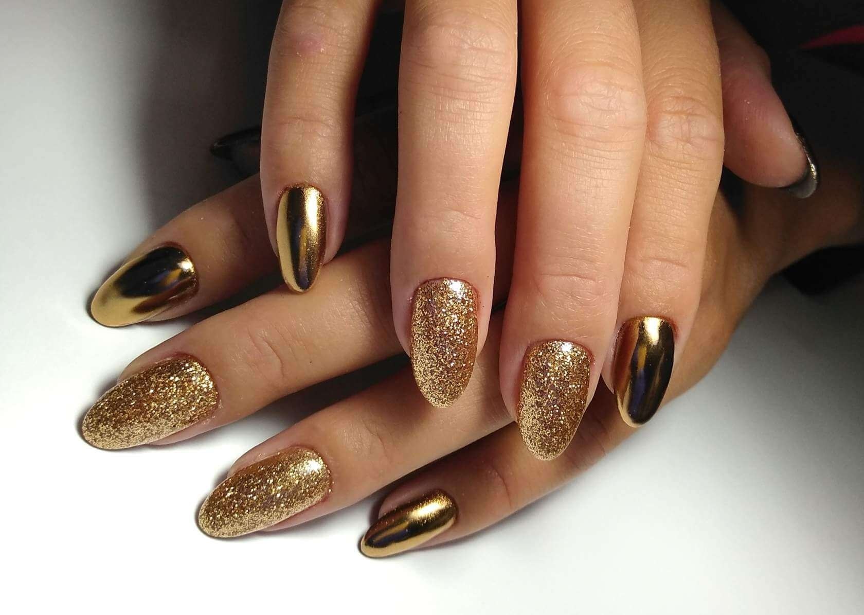 Коричневый маникюр с золотом на миндалевидных ногтях (43 фото)