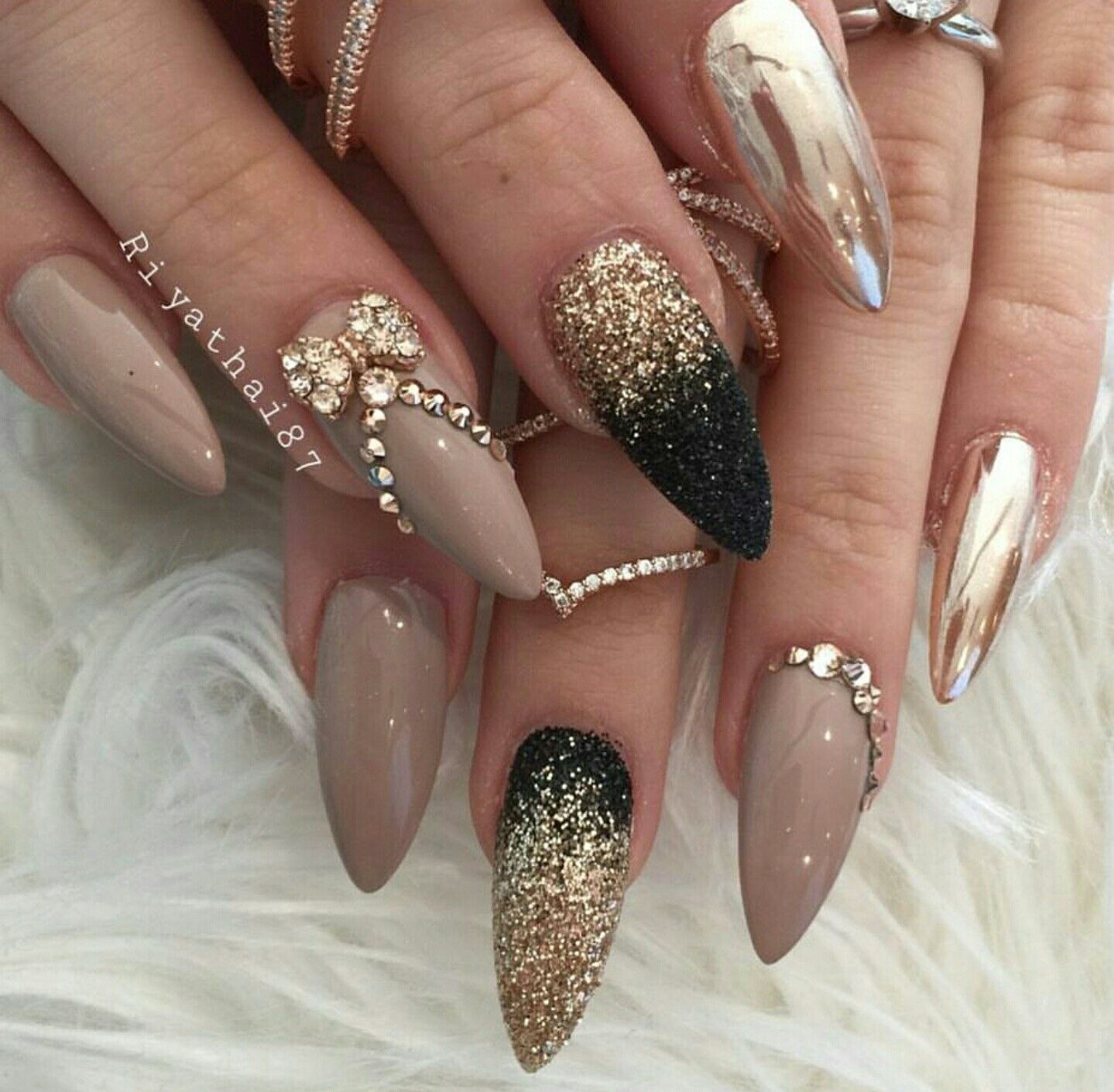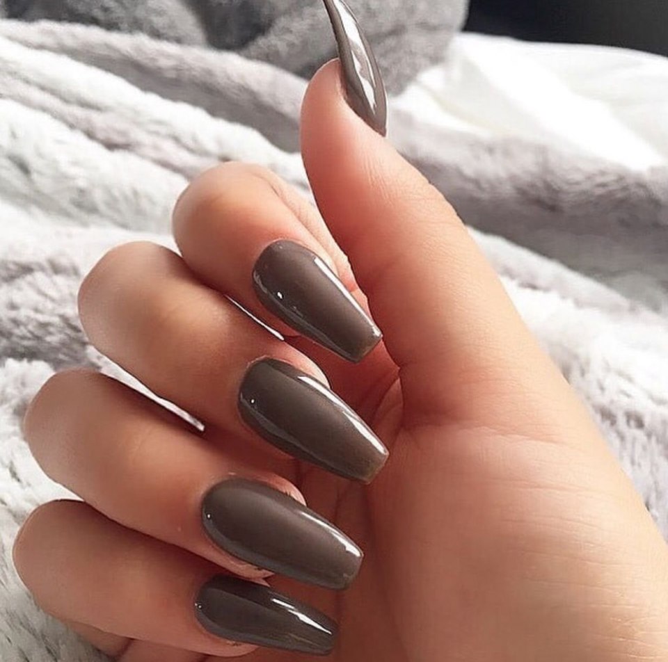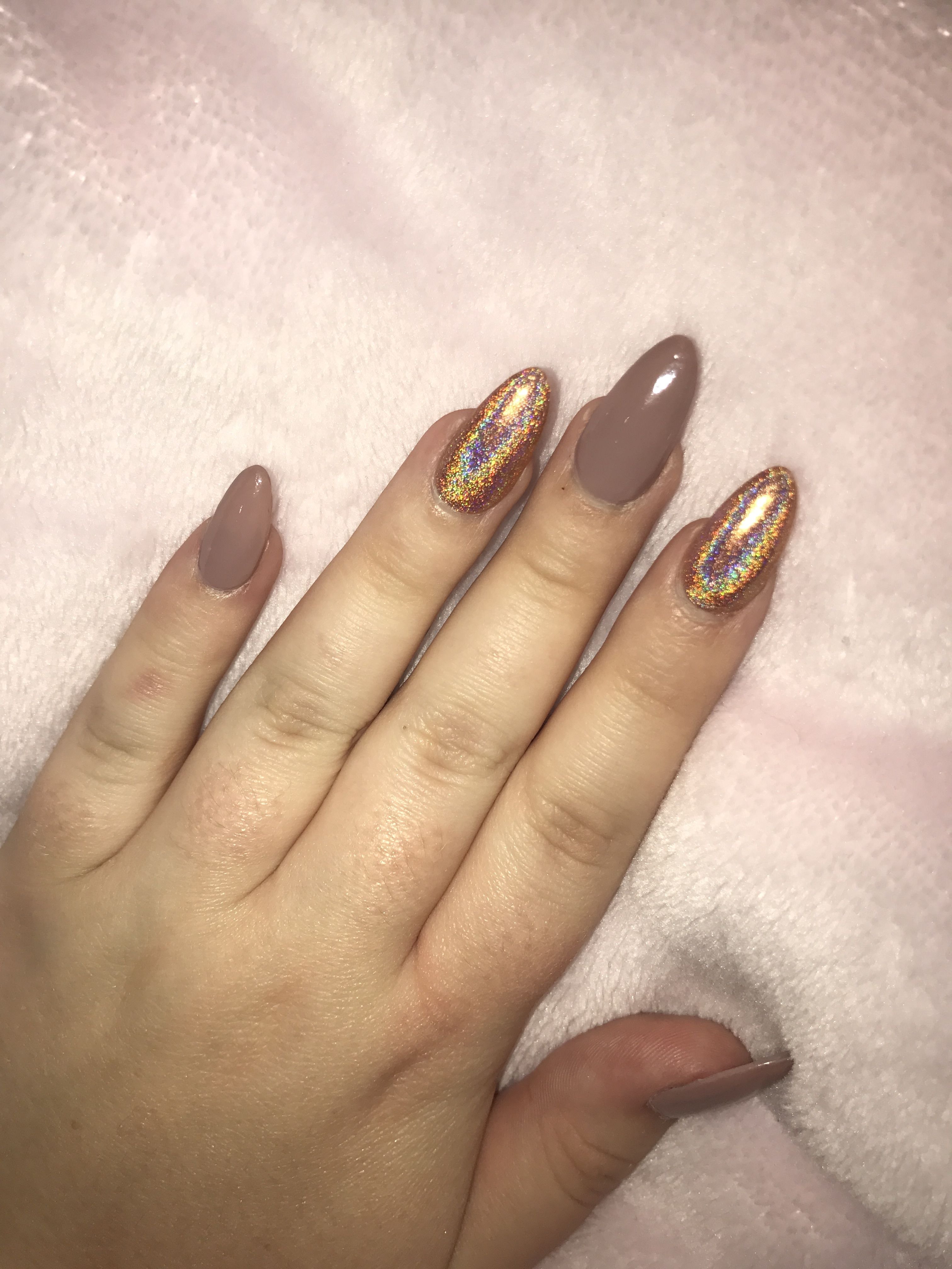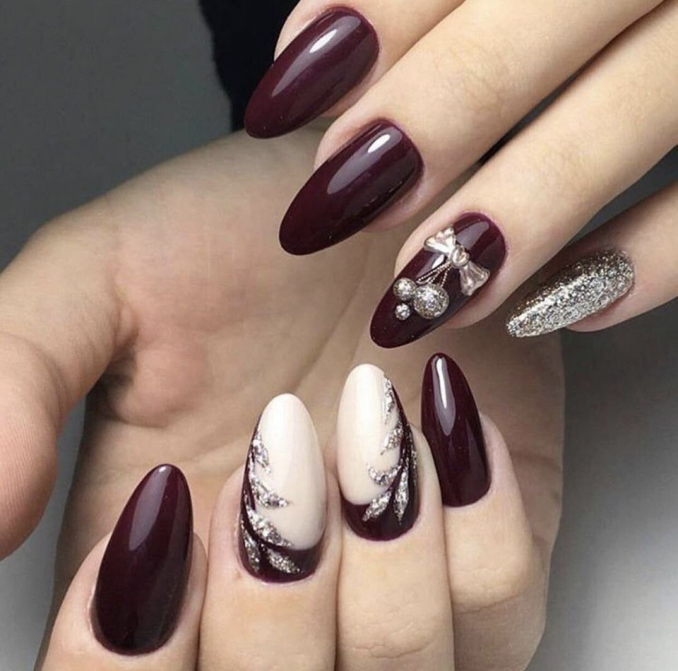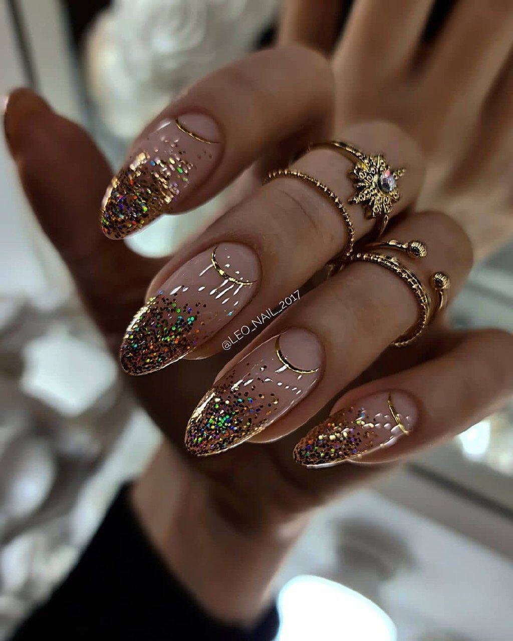 Коричневый маникюр с золотом на миндалевидных ногтях (43 фото)