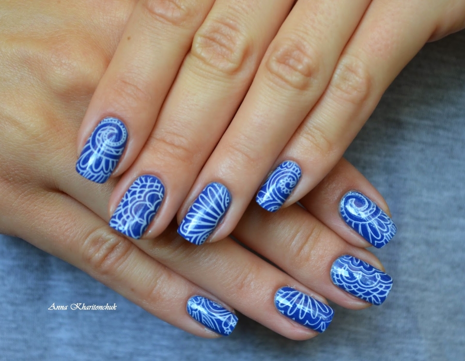 Синий маникюр с белым стемпингом