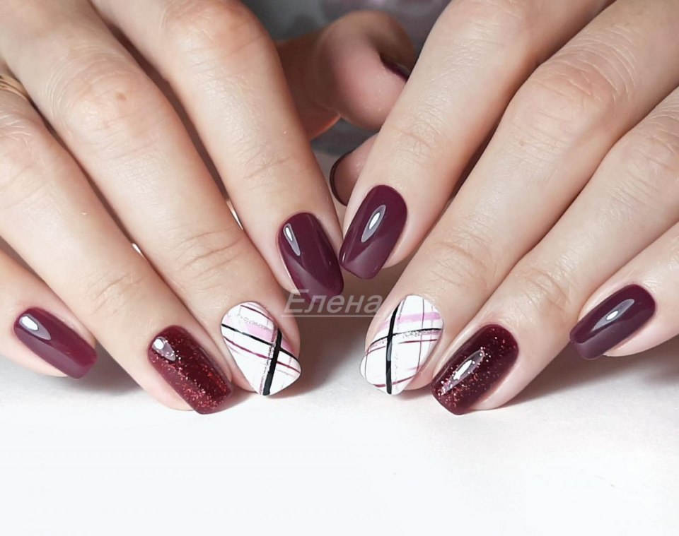 Маникюр на короткие ногти френч бордовый цвет с полосками
