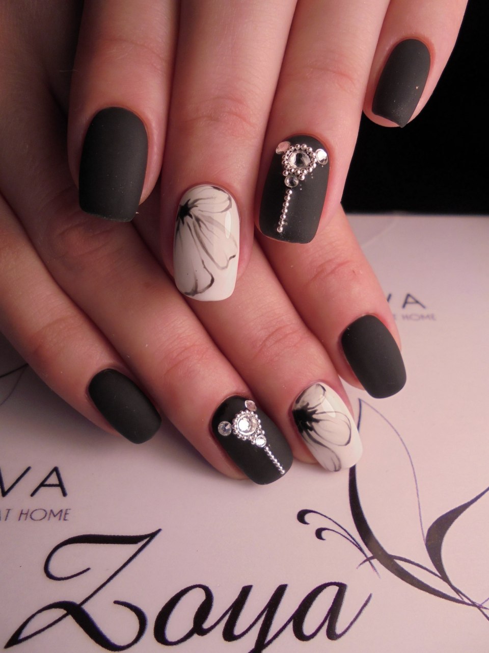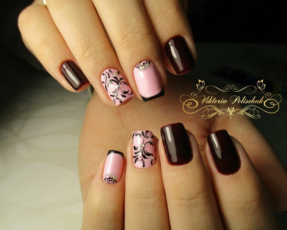Маникюр на короткие квадратные ногти темных оттенков с рисунком (29 фото)
