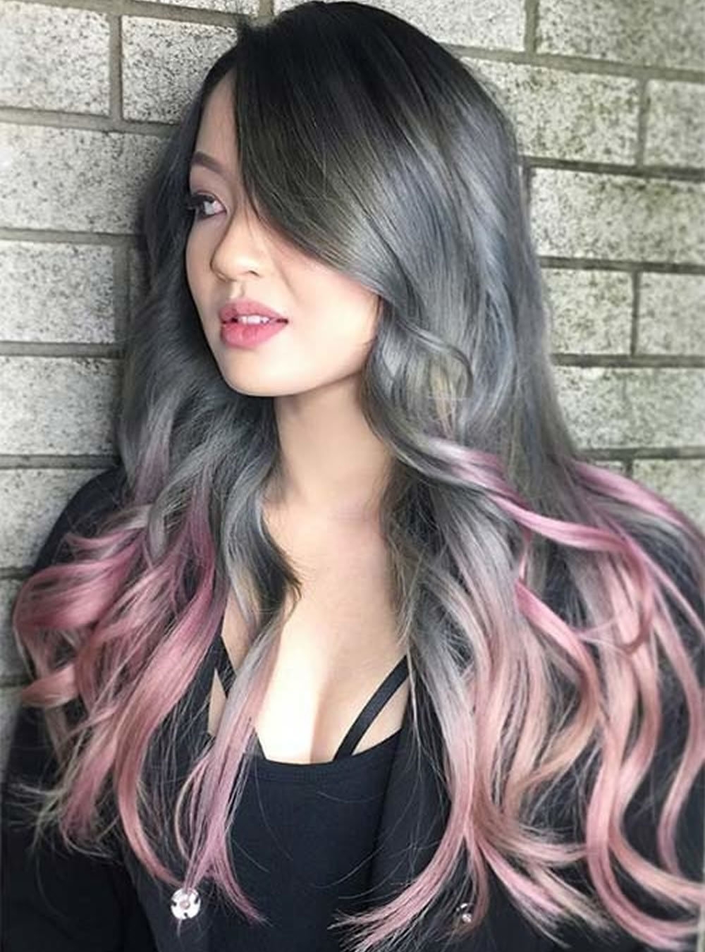 Черные волосы с розовыми прядями