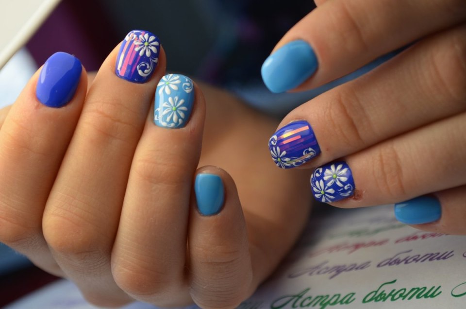 Синий маникюр с цветочками