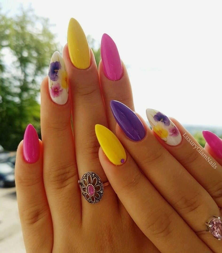Разноцветный маникюр на миндалевидных ногтях
