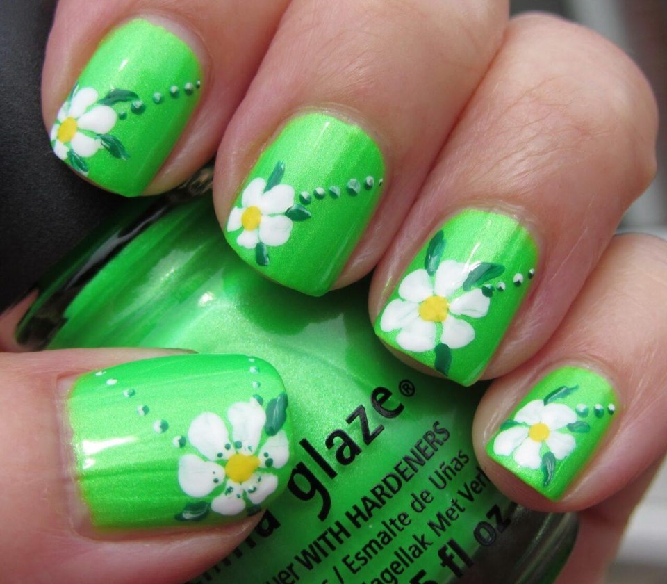 Маникюр салатовый с ромашками