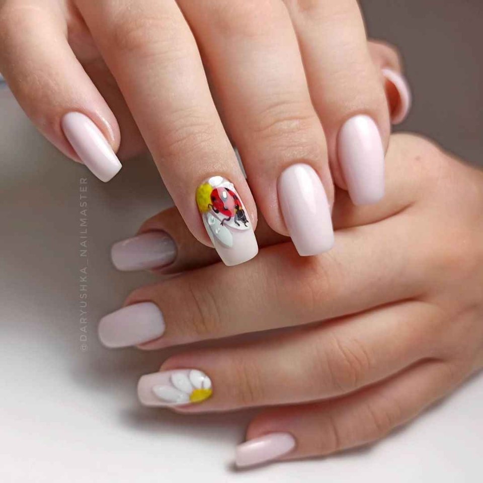 Маникюр с Божьей коровкой и ромашкой