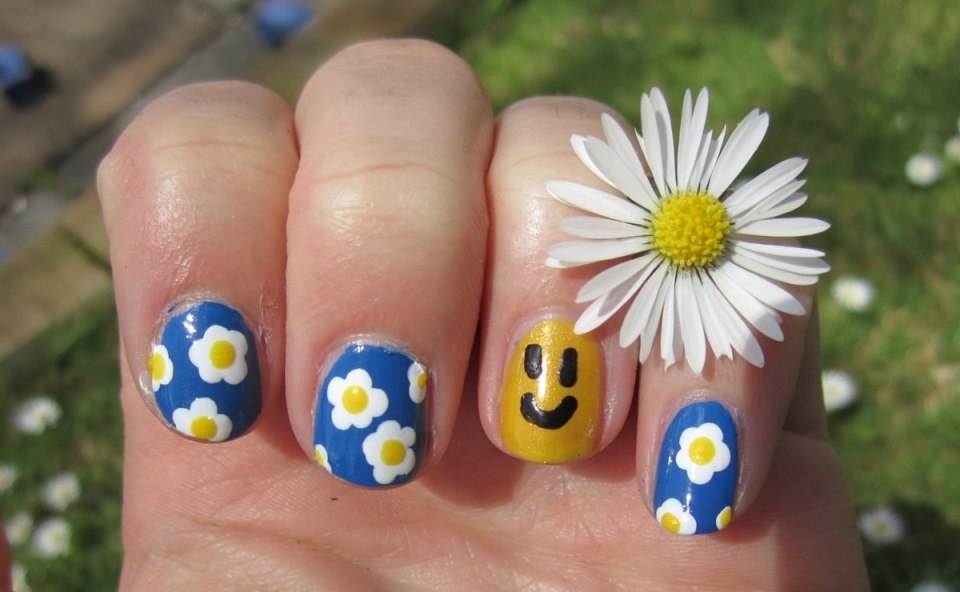 Голубой маникюр с ромашками