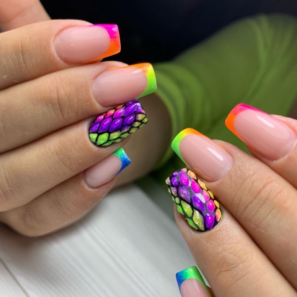 Яркий разноцветный дизайн ногтей френч лето 2023 (99 фото)