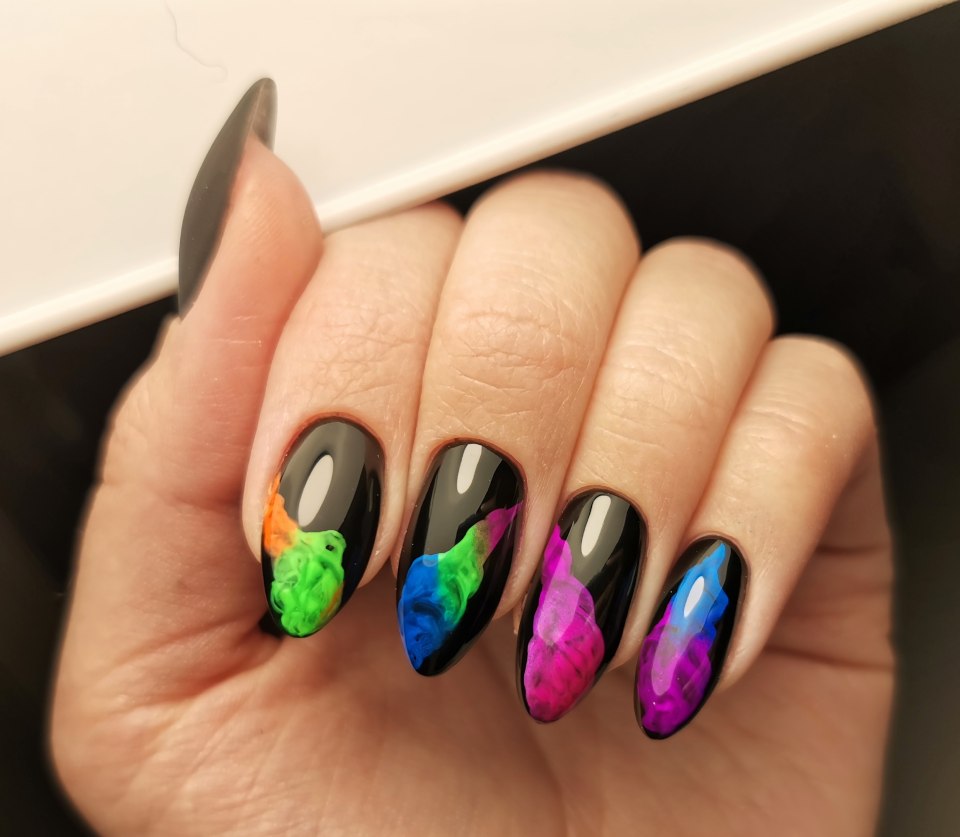 Черный маникюр с яркими разводами