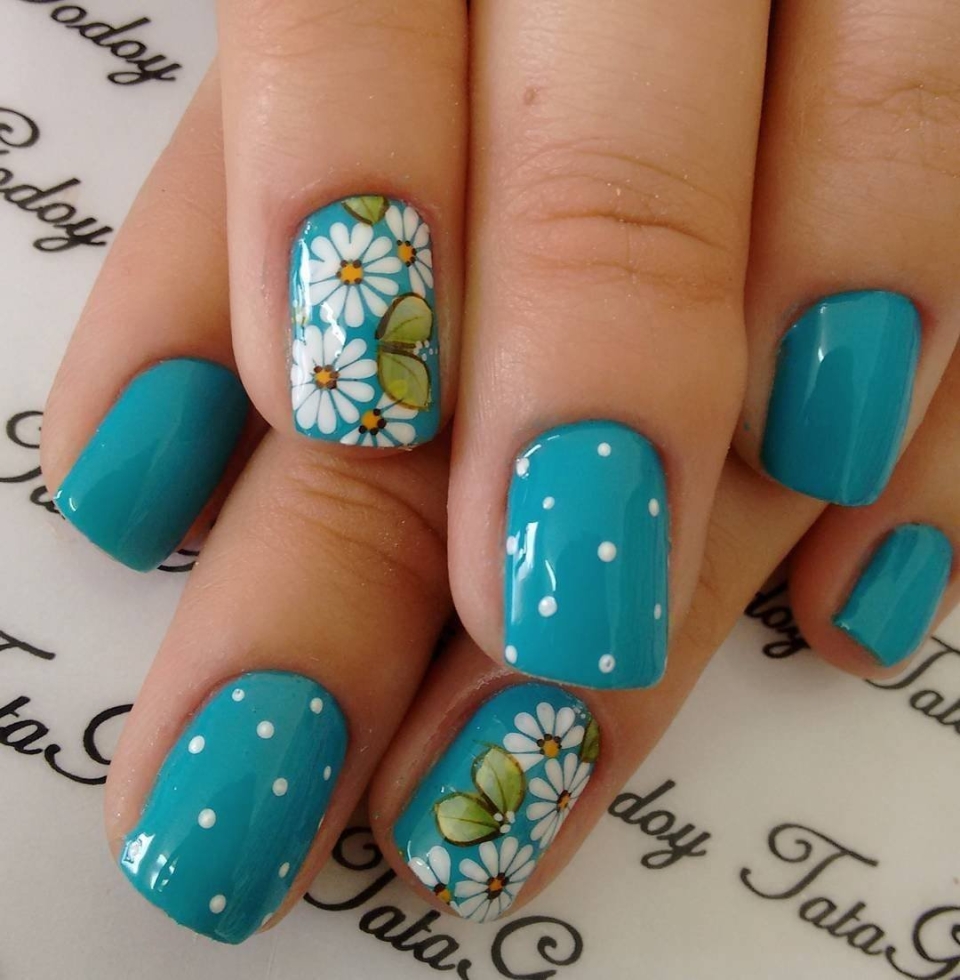 Бирюзовые ногти с ромашками