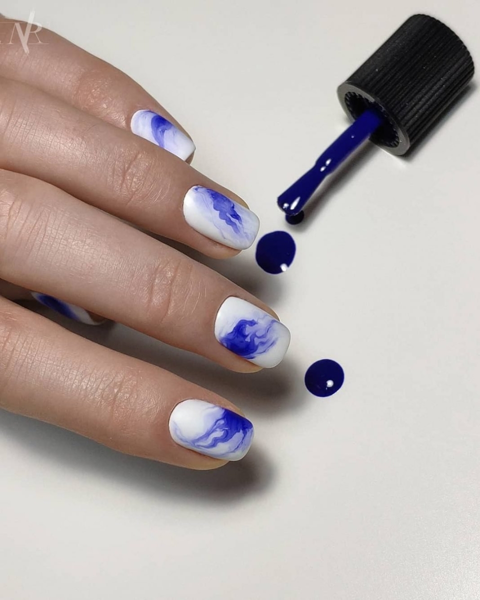 Синий маникюр с разводами