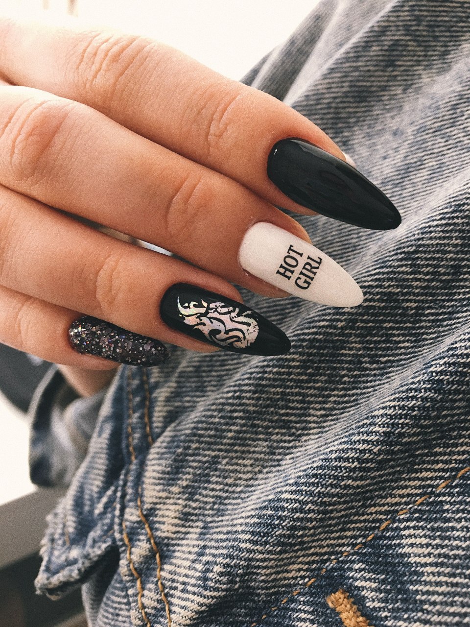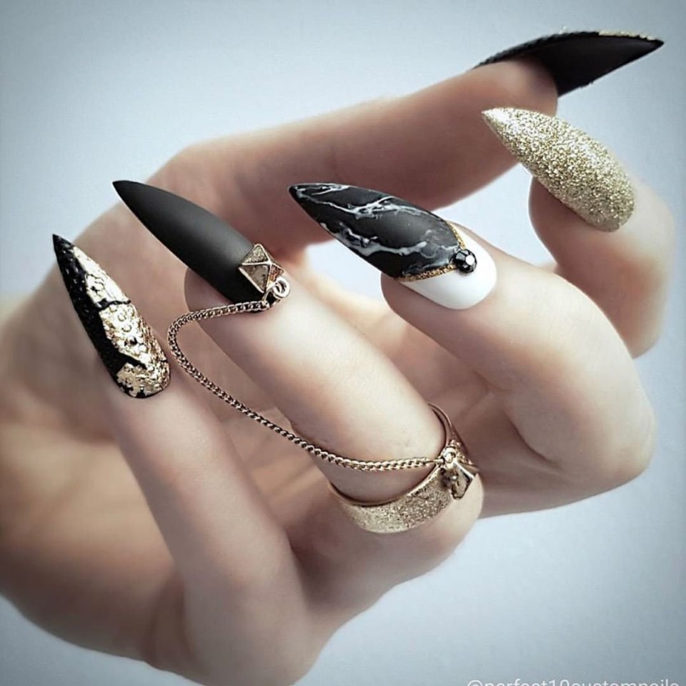 Чёрный маникюр на длинные ногти острые